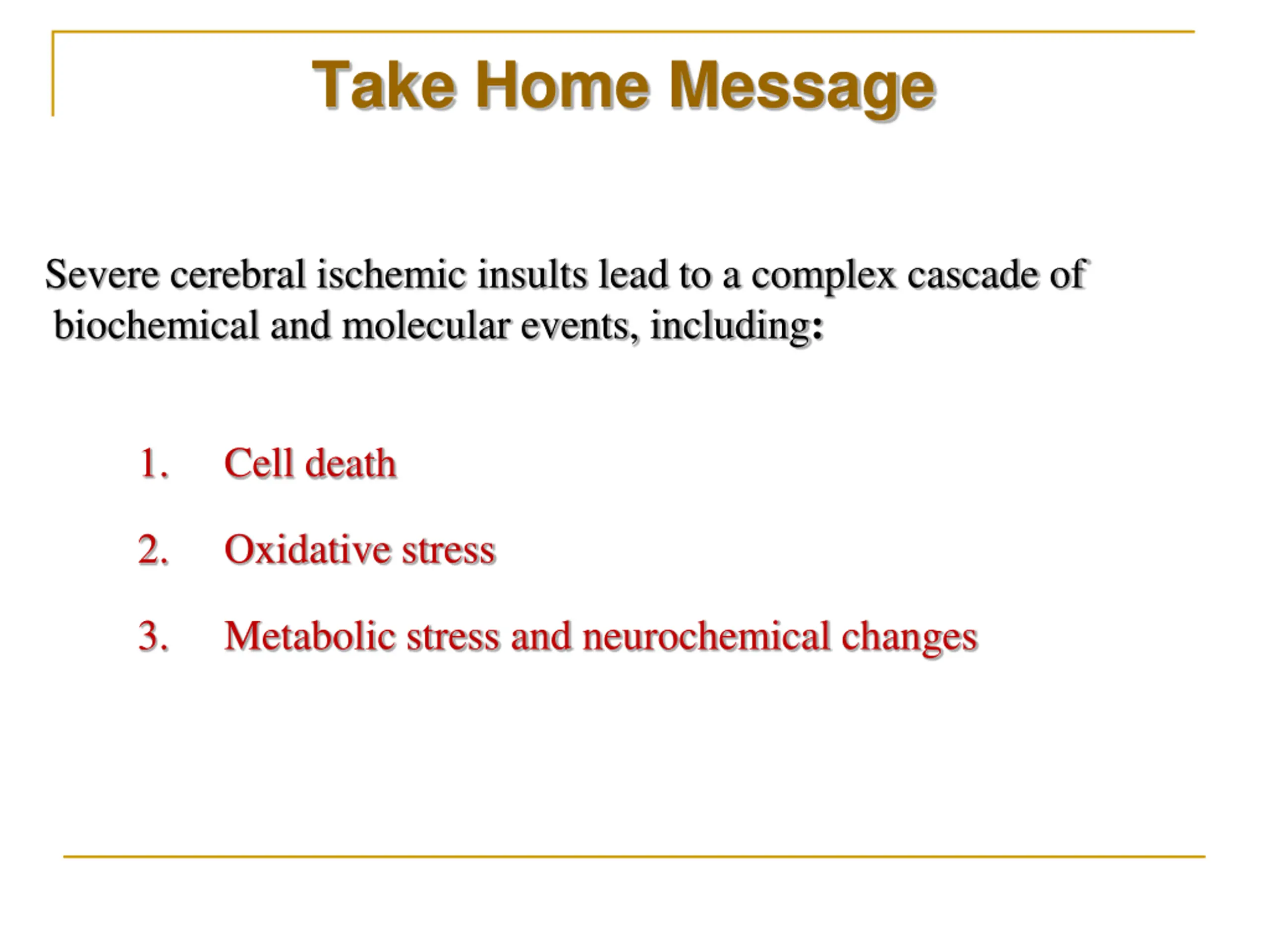 Take Home Message Severe cerebral ischemic insults lead to a complex cascade of biochemical and molecular events, including: 1. Cell death 2. Oxidative stress 3. Metabolic stress and neurochemical changes