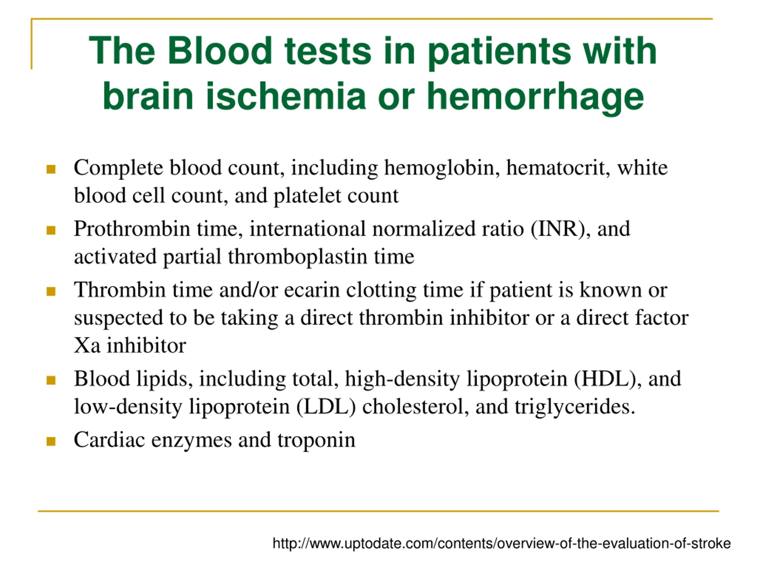 The Blood tests in patients with brain ischemia or hemorrhage Complete blood count, including hemoglobin, hematocrit, white blood cell count, and platelet count Prothrombin time, international normalized ratio (INR), and activated partial thromboplastin time Thrombin time and/or ecarin clotting time if patient is known or suspected to be taking a direct thrombin inhibitor or a direct factor Xa inhibitor Blood lipids, including total, high-density lipoprotein (HDL), and low-density lipoprotein (LDL) cholesterol, and triglycerides. Cardiac enzymes and troponin http://www.uptodate.com/contents/overview-of-the-evaluation-of-stroke
