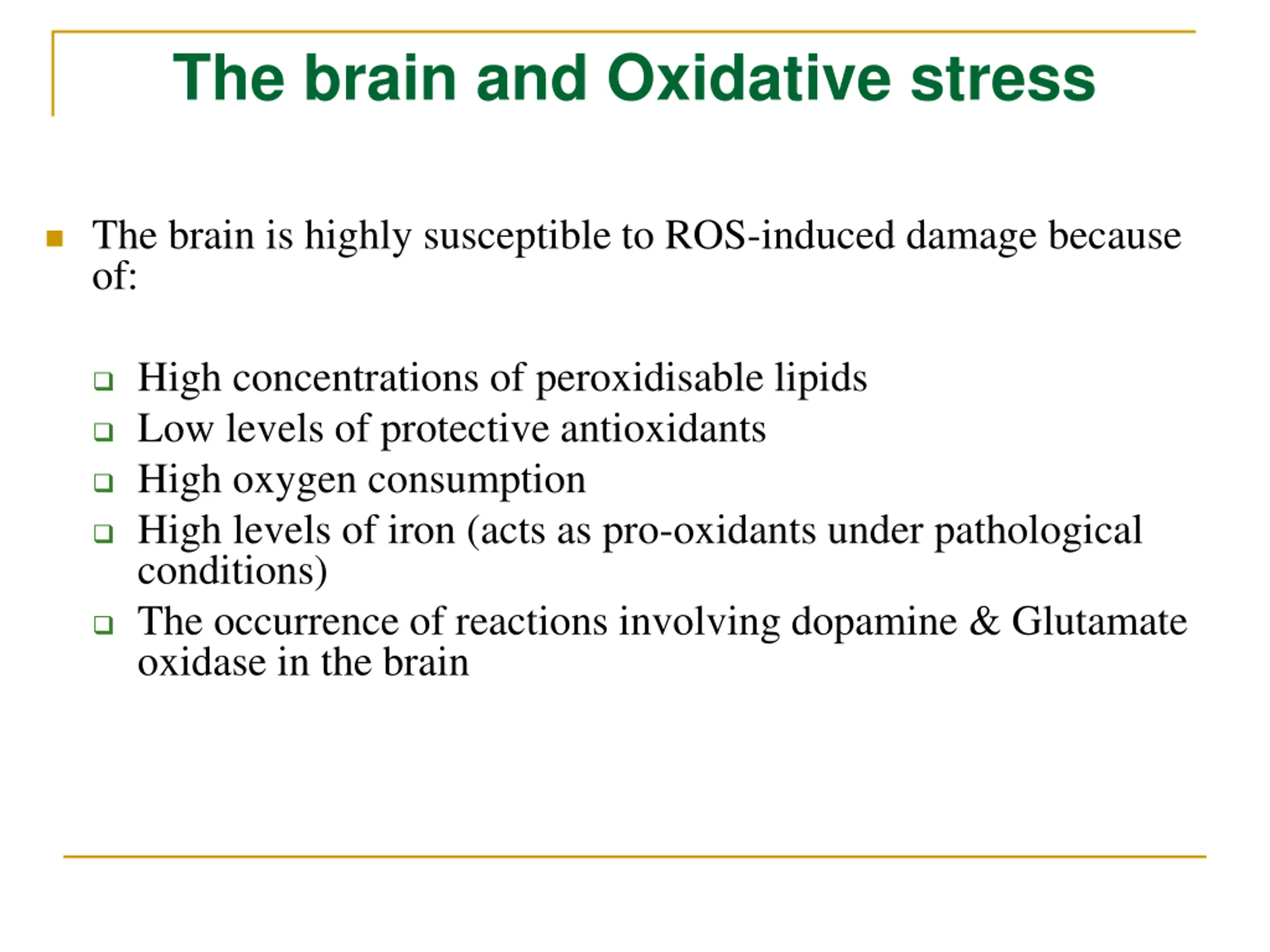 The brain and Oxidative stress The brain is highly susceptible to ROS-induced damage because of: High concentrations of peroxidisable lipids Low levels of protective antioxidants High oxygen consumption High levels of iron (acts as pro-oxidants under pathological conditions) The occurrence of reactions involving dopamine & Glutamate oxidase in the brain