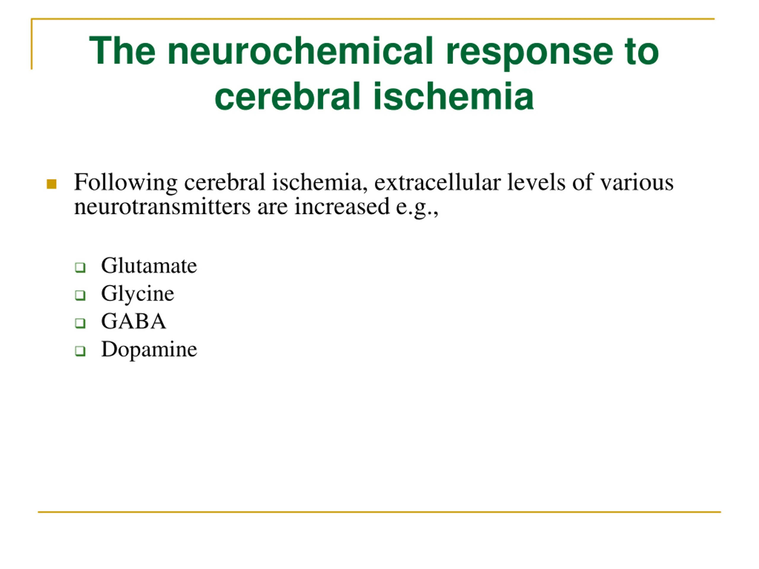 The neurochemical response to cerebral ischemia Following cerebral ischemia, extracellular levels of various neurotransmitters are increased e.g., Glutamate Glycine GABA Dopamine