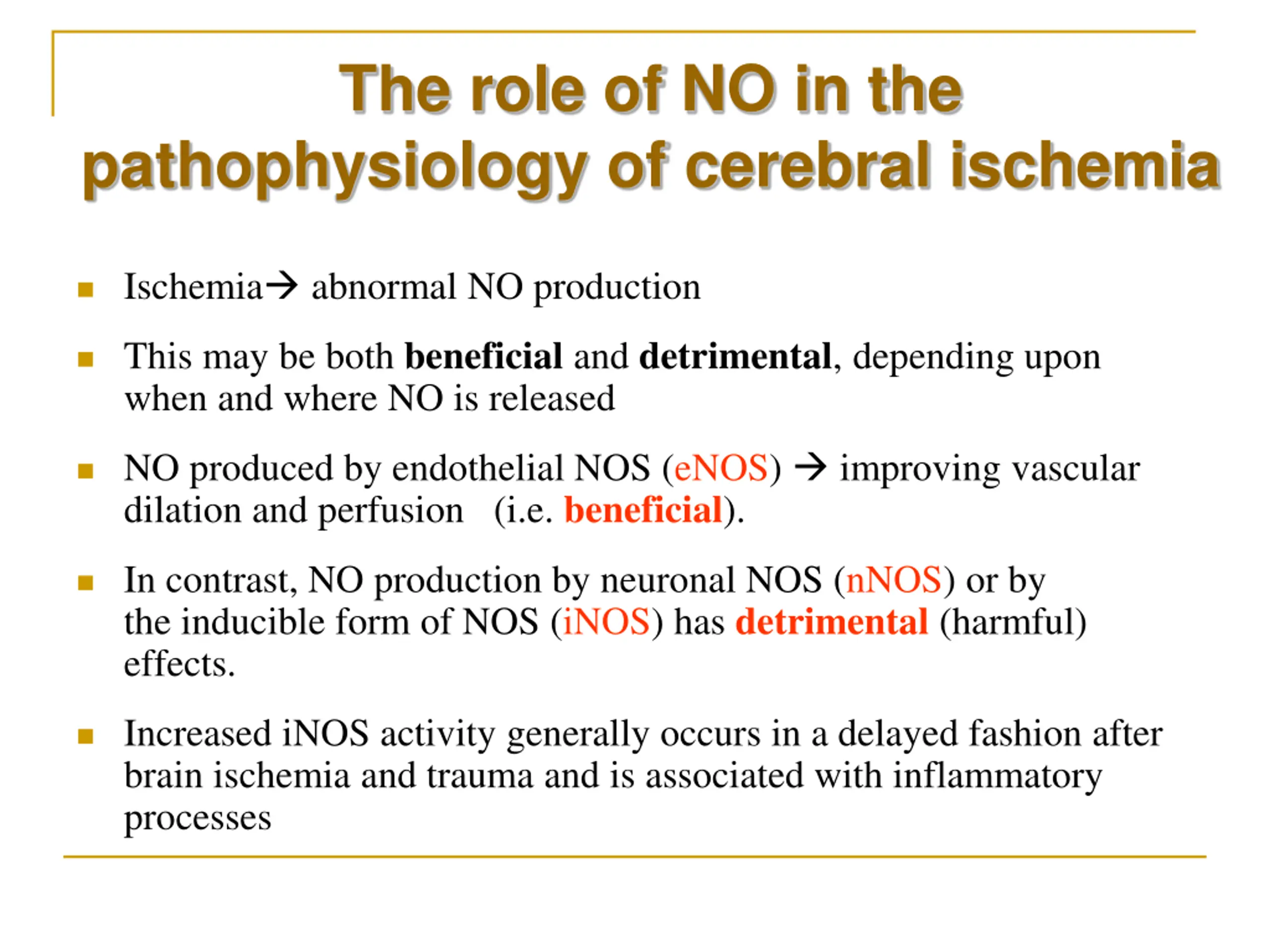 The role of NO in the pathophysiology of cerebral ischemia Ischemia abnormal NO production This may be both beneficial and detrimental, depending upon when and where NO is released NO produced by endothelial NOS(eNOS) improving vascular dilation and perfusion(i.e. beneficial). In contrast, NO production by neuronal NOS(nNOS) or by the inducible form of NOS(iNOS) has detrimental (harmful) effects. Increased iNOS activity generally occurs in a delayed fashion after brain ischemia and trauma and is associated with inflammatory processes