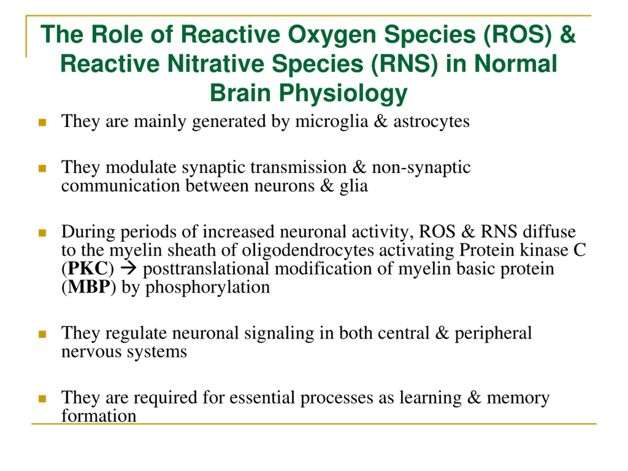 The Role of Reactive Oxygen Species (ROS) & Reactive Nitrative Species (RNS) in Normal Brain Physiology They are mainly generated by microglia & astrocytes They modulate synaptic transmission & non-synaptic communication between neurons & glia During periods of increased neuronal activity, ROS & RNS diffuse to the myelin sheath of oligodendrocytes activating Protein kinase C (PKC) posttranslational modification of myelin basic protein (MBP) by phosphorylation They regulate neuronal signaling in both central & peripheral nervous systems They are required for essential processes as learning & memory formation