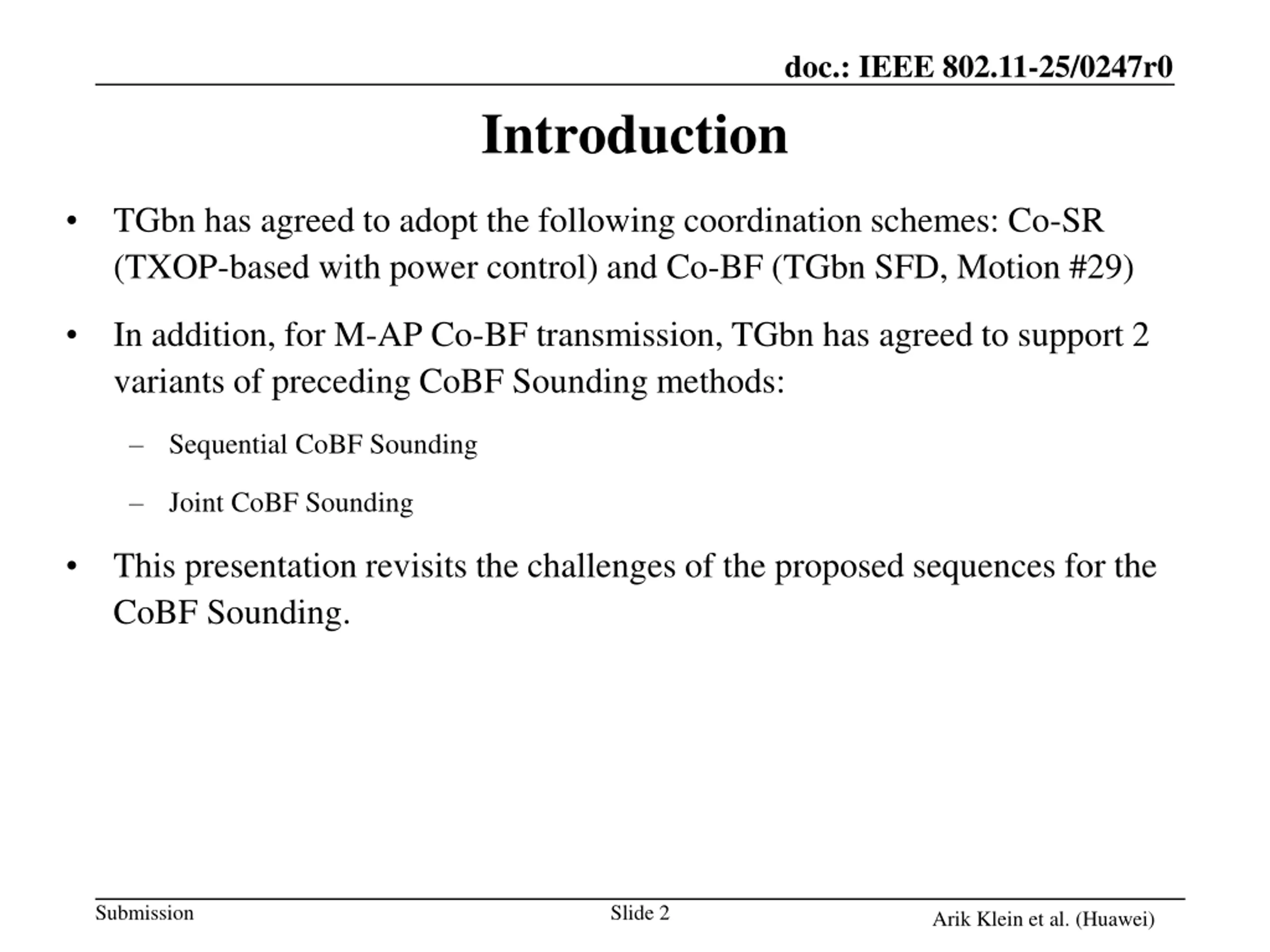 doc.: IEEE 802.11-25/0247r0 Introduction TGbn has agreed to adopt the following coordination schemes: Co-SR (TXOP-based with power control) and Co-BF (TGbn SFD, Motion #29) In addition, for M-AP Co-BF transmission, TGbn has agreed to support 2 variants of preceding CoBF Sounding methods: Sequential CoBF Sounding Joint CoBF Sounding This presentation revisits the challenges of the proposed sequences for the CoBF Sounding. Submission Slide 2 Arik Klein et al. (Huawei)