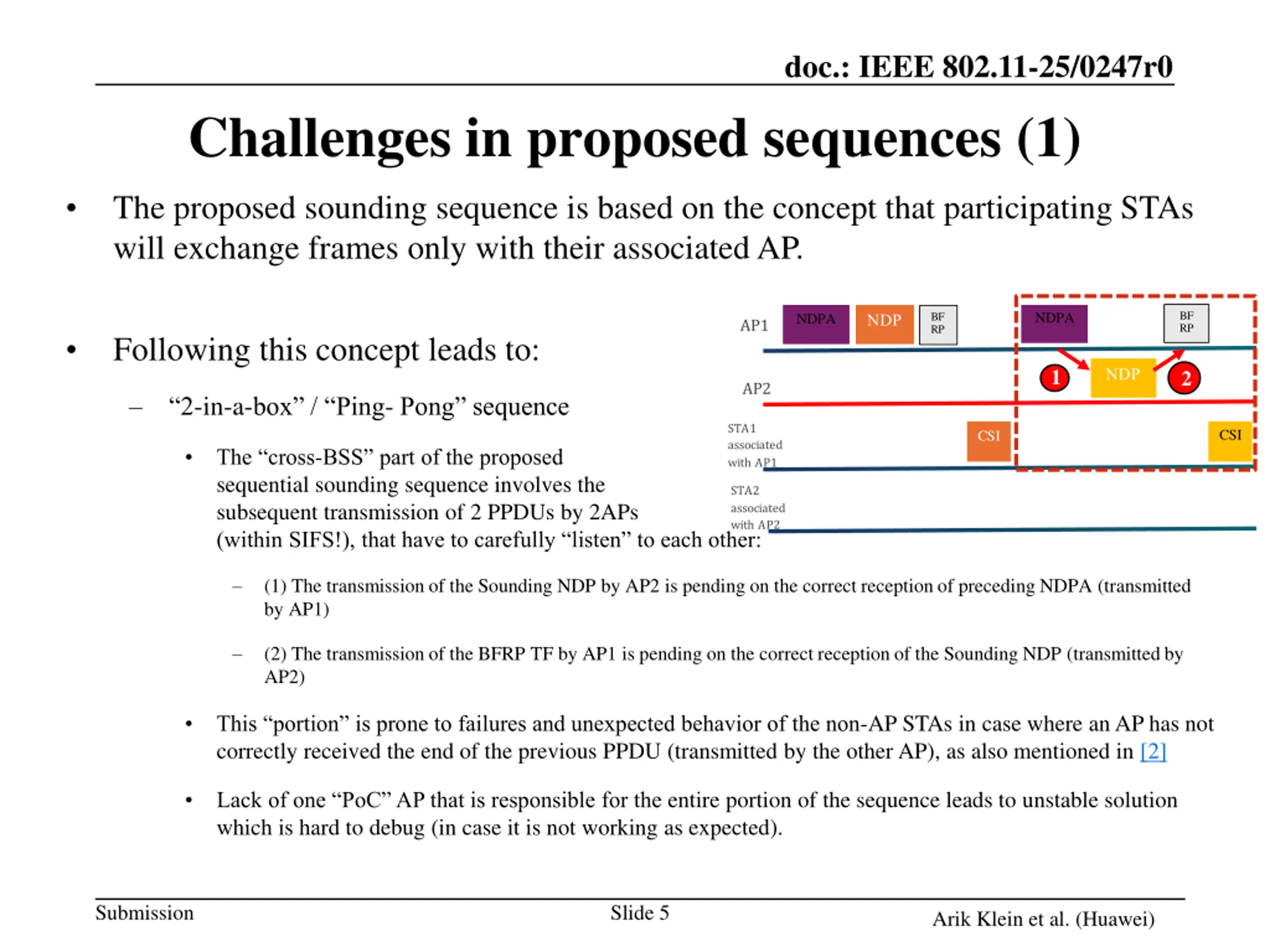doc.: IEEE 802.11-25/0247r0 Challenges in proposed sequences (1) The proposed sounding sequence is based on the concept that participating STAs will exchange frames only with their associated AP. BF RP NDPA BF RP NDPA AP1 Following this concept leads to: BF RP BF RP NDPA NDPA 1 2 AP2 2-in-a- ox / ing- ong sequen e STA1 associated with AP1 CSI CSI The ross-BSS part of the proposed sequential sounding sequence involves the subsequent transmission of 2 PPDUs by 2APs (within SIFS!), that have to arefully listen to ea h other: STA2 associated with AP2 CSI CSI (1) The transmission of the Sounding NDP by AP2 is pending on the correct reception of preceding NDPA (transmitted by AP1) (2) The transmission of the BFRP TF by AP1 is pending on the correct reception of the Sounding NDP (transmitted by AP2) This portion is prone to failures and unexpe ted ehavior of the non-AP STAs in case where an AP has not correctly received the end of the previous PPDU (transmitted by the other AP), as also mentioned in [2] a of one oC A that is responsi le for the entire portion of the sequence leads to unstable solution which is hard to debug (in case it is not working as expected). Submission Slide 5 Arik Klein et al. (Huawei)