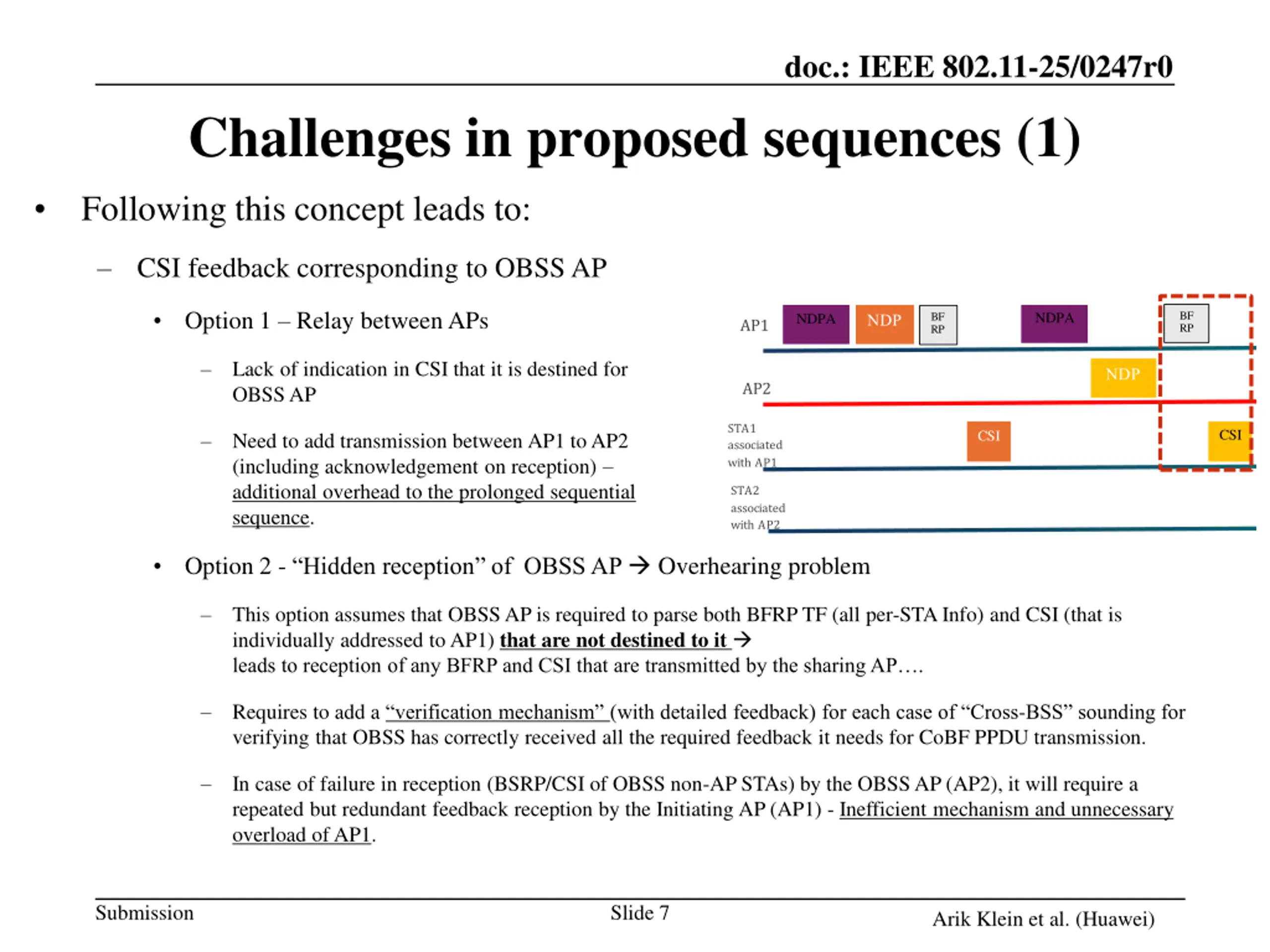 doc.: IEEE 802.11-25/0247r0 Challenges in proposed sequences (1) Following this concept leads to: CSI feedback corresponding to OBSS AP BF RP NDPA BF RP NDPA The CSI feedback transmitted by STA1 is intended to AP2 (though it is transmitted to AP1) AP1 BF RP BF RP NDPA NDPA AP2 It is clear, that the following that the transmission of the CoBF PPDU an t start if the CSI feedback will not be received by the OBSS AP (AP2). STA1 associated with AP1 CSI CSI STA2 associated with AP2 CSI CSI However, the proposed sequence does not provide any further details on how the CSI feedback (corresponding to the OBSS AP) is conveyed to the OBSS AP? 2 options may be assumed for this gap: Relay from Sharing AP to OBSS AP Hidden re eption of OBSS AP Submission Slide 6 Arik Klein et al. (Huawei)