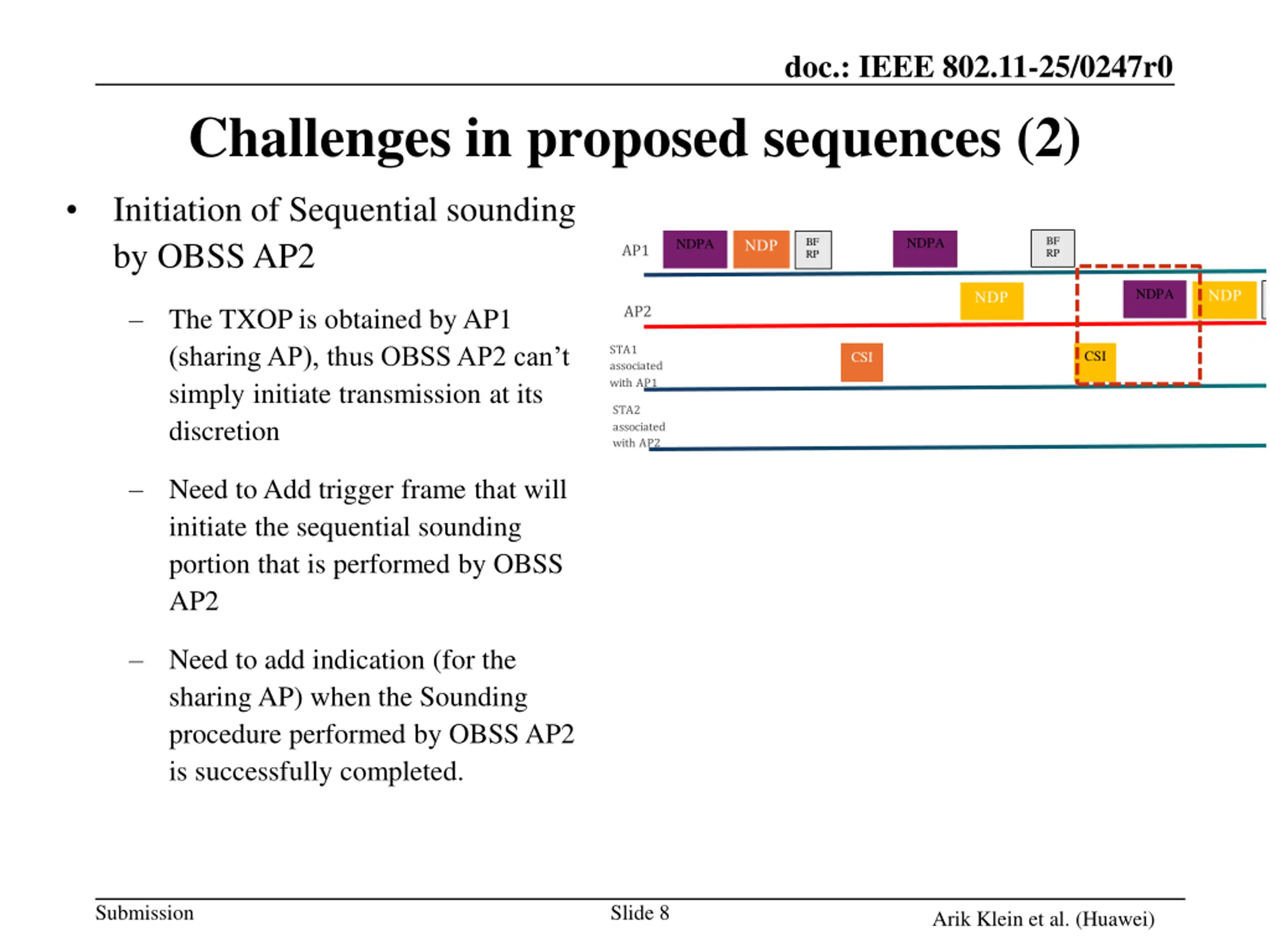doc.: IEEE 802.11-25/0247r0 Challenges in proposed sequences (2) Initiation of Sequential sounding by OBSS AP2 BF RP NDPA BF RP NDPA AP1 BF RP BF RP NDPA NDPA AP2 The TXOP is obtained by AP1 (sharing A ), thus OBSS A 2 an t simply initiate transmission at its discretion STA1 associated with AP1 CSI CSI STA2 associated with AP2 CSI CSI Need to Add trigger frame that will initiate the sequential sounding portion that is performed by OBSS AP2 Need to add indication (for the sharing AP) when the Sounding procedure performed by OBSS AP2 is successfully completed. Submission Slide 8 Arik Klein et al. (Huawei)