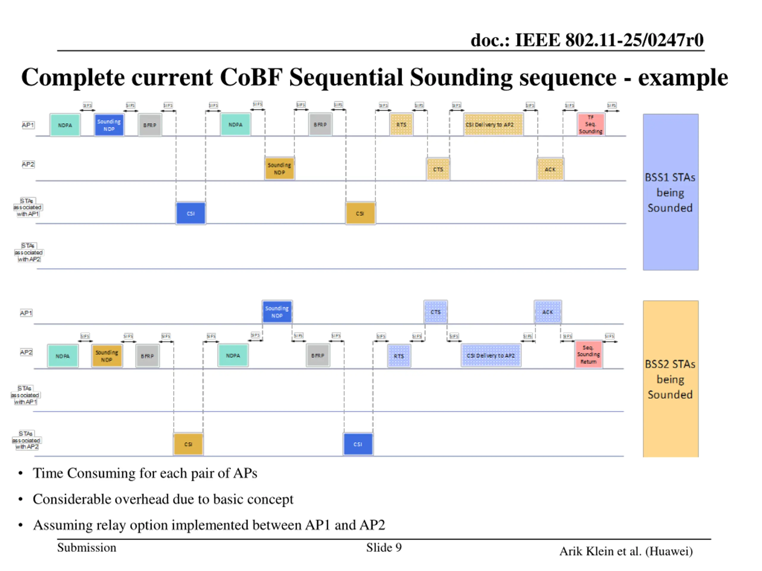 doc.: IEEE 802.11-25/0247r0 Complete current CoBF Sequential Sounding sequence - example Time Consuming for each pair of APs Considerable overhead due to basic concept Assuming relay option implemented between AP1 and AP2 Submission Slide 9 Arik Klein et al. (Huawei)