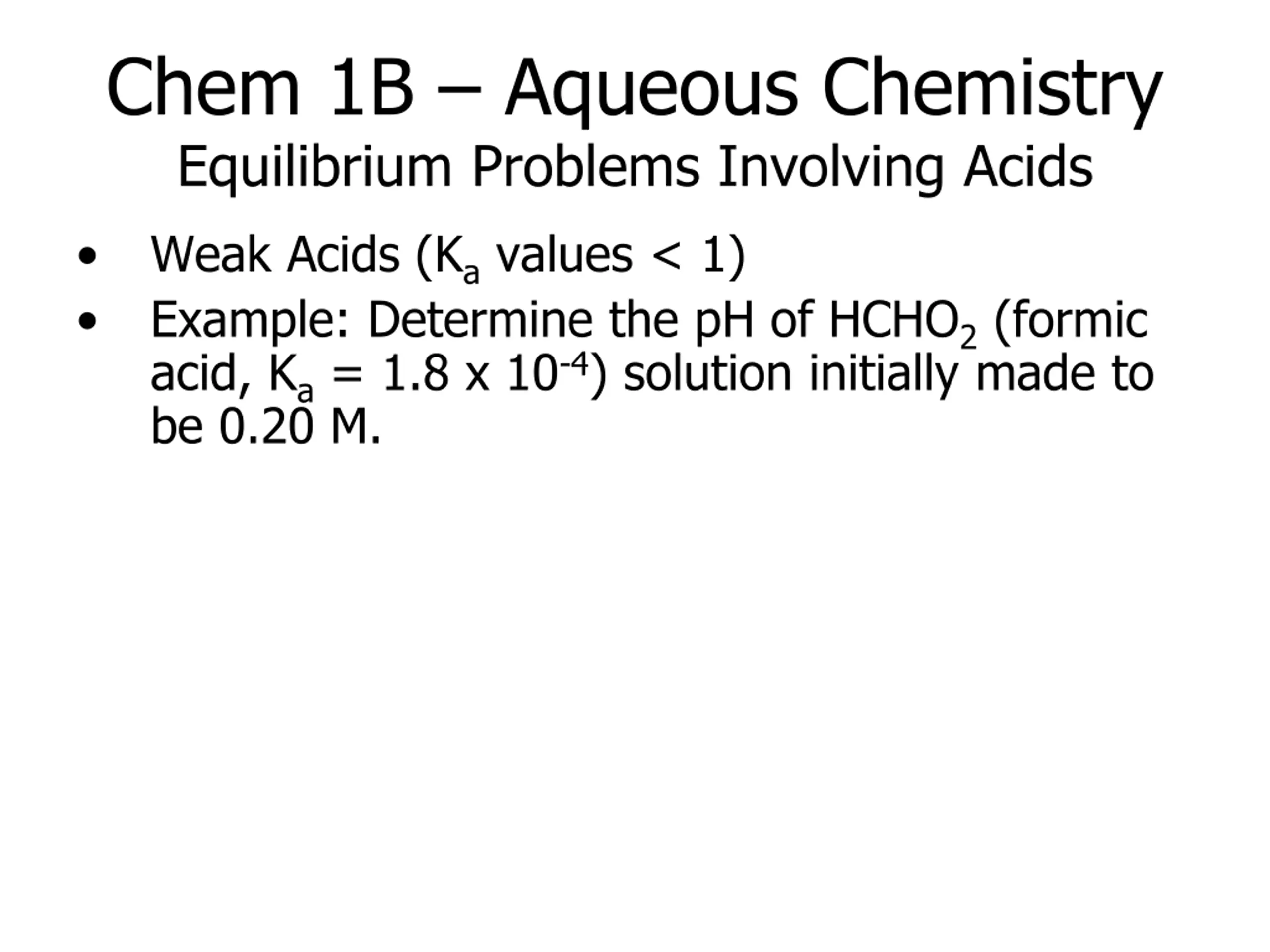 Chem 1B Aqueous Chemistry Equilibrium Problems Involving Acids Weak Acids (Ka values < 1) Example: Determine the pH of HCHO2 (formic acid, Ka = 1.8 x 10-4) solution initially made to be 0.20 M.