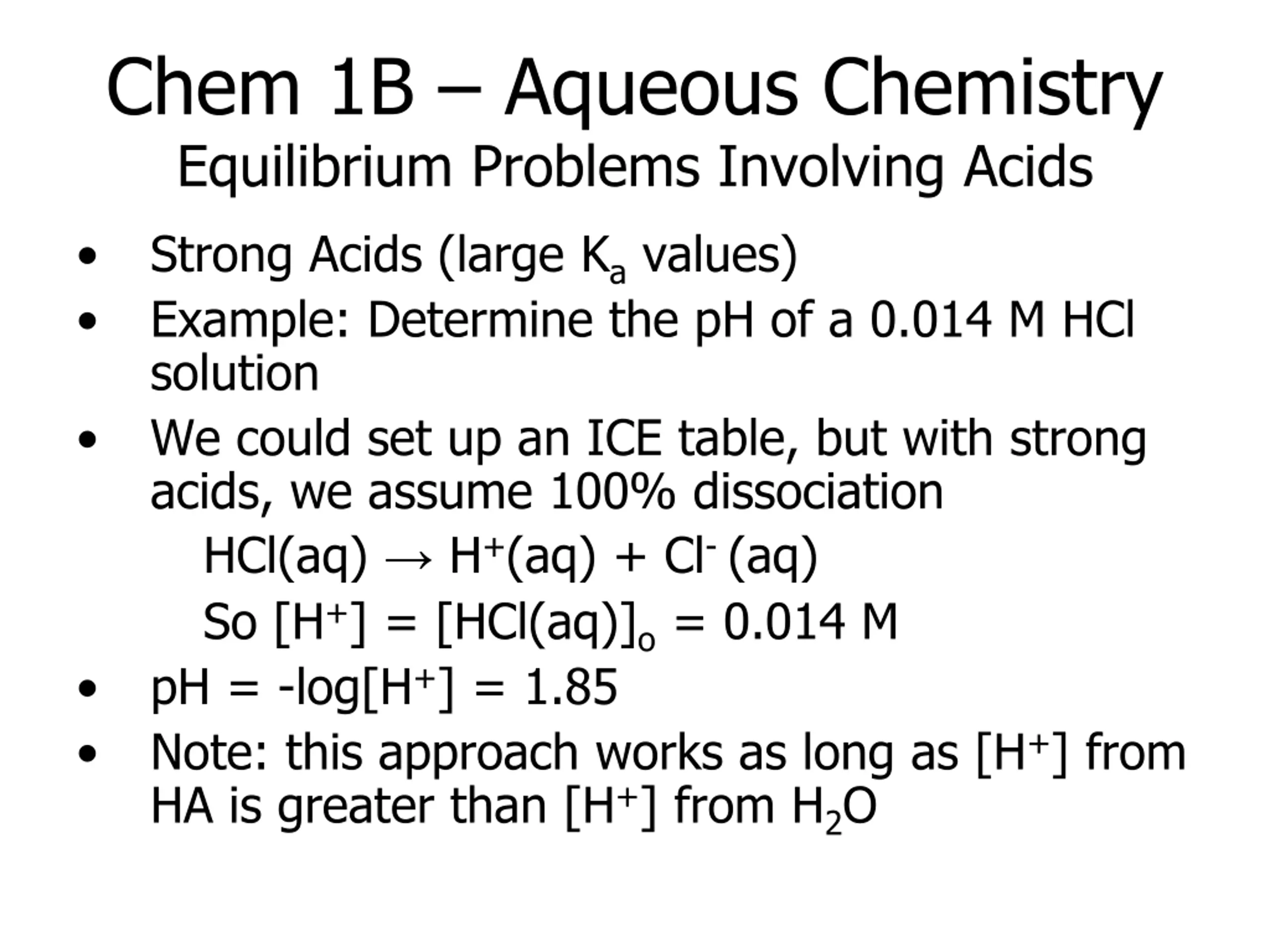 Chem 1B Aqueous Chemistry Equilibrium Problems Involving Acids Strong Acids (large Ka values) Example: Determine the pH of a 0.014 M HCl solution We could set up an ICE table, but with strong acids, we assume 100% dissociation HCl(aq) H+(aq) + Cl- (aq) So [H+] = [HCl(aq)]o = 0.014 M pH = -log[H+] = 1.85 Note: this approach works as long as [H+] from HA is greater than [H+] from H2O