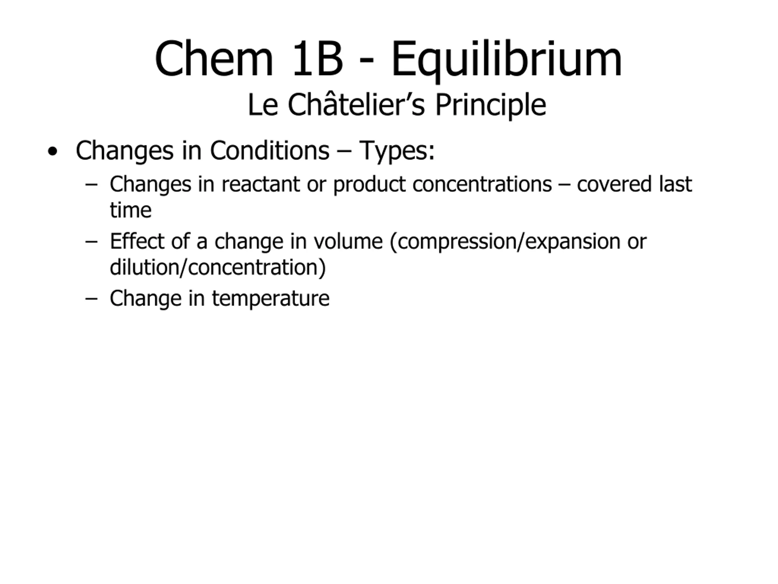 Chem 1B - Equilibrium Le Ch telier s Principle Changes in Conditions Types: Changes in reactant or product concentrations covered last time Effect of a change in volume (compression/expansion or dilution/concentration) Change in temperature