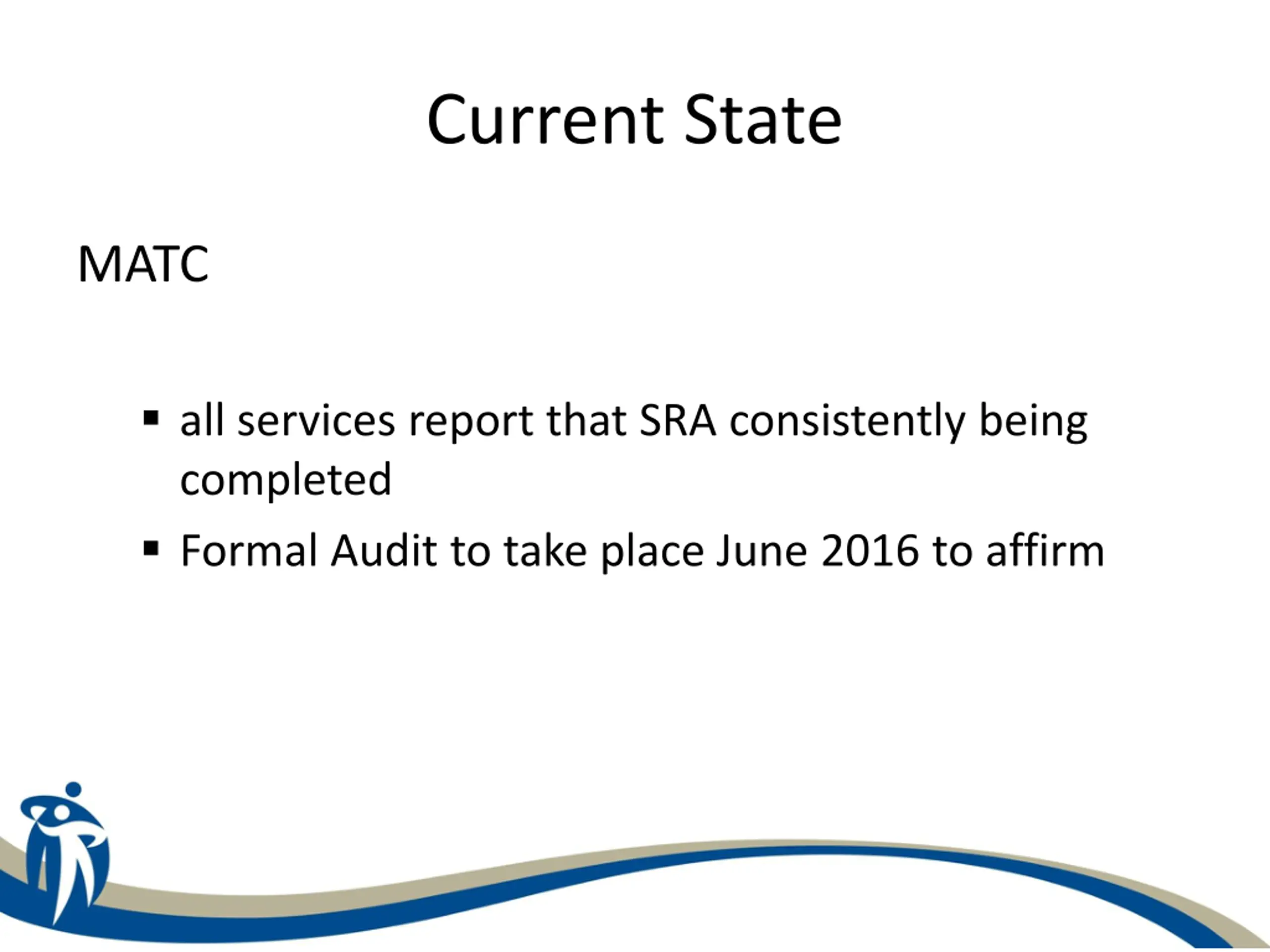 Current State MATC all services report that SRA consistently being completed Formal Audit to take place June 2016 to affirm