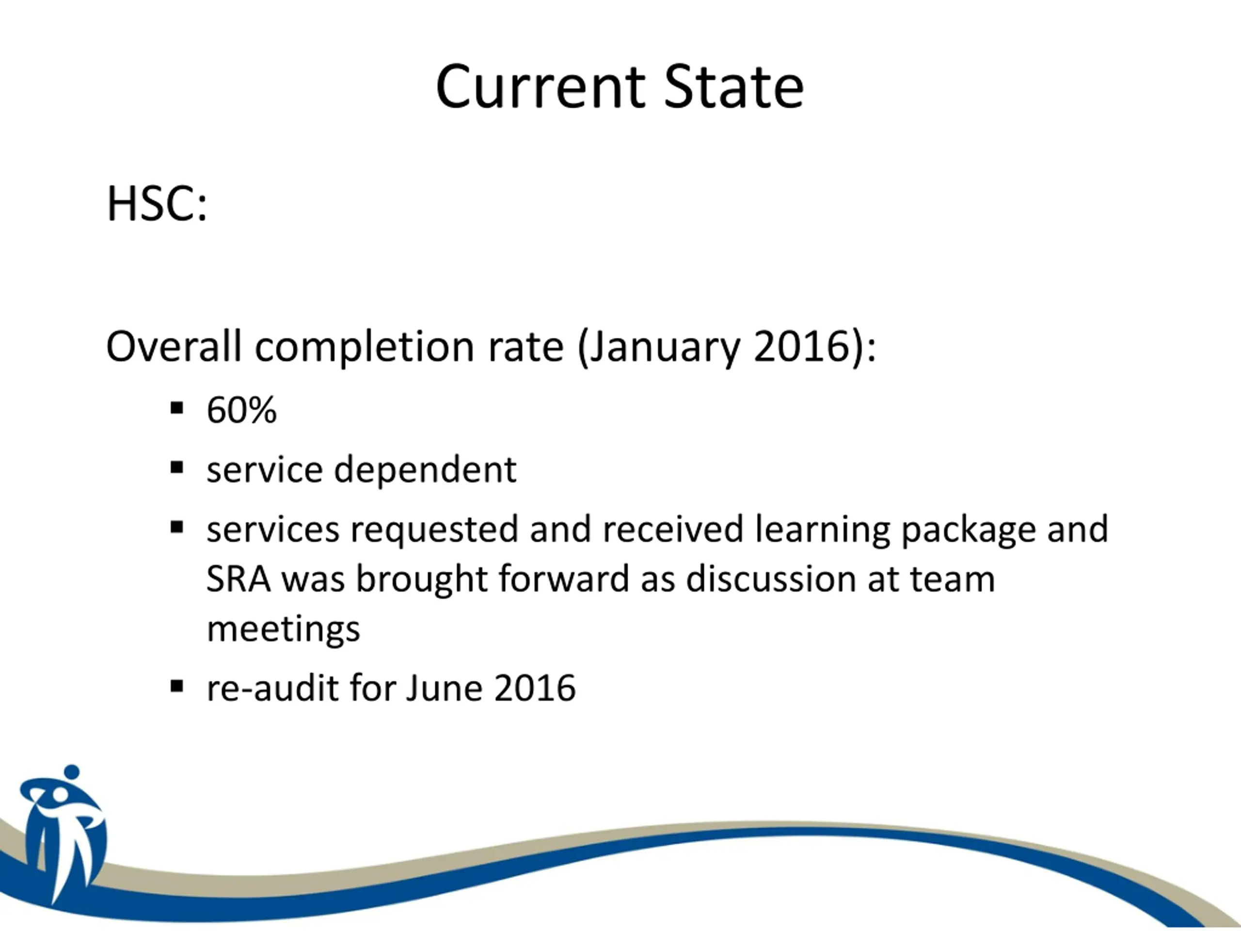Current State HSC: Overall completion rate (January 2016): 60% service dependent services requested and received learning package and SRA was brought forward as discussion at team meetings re-audit for June 2016