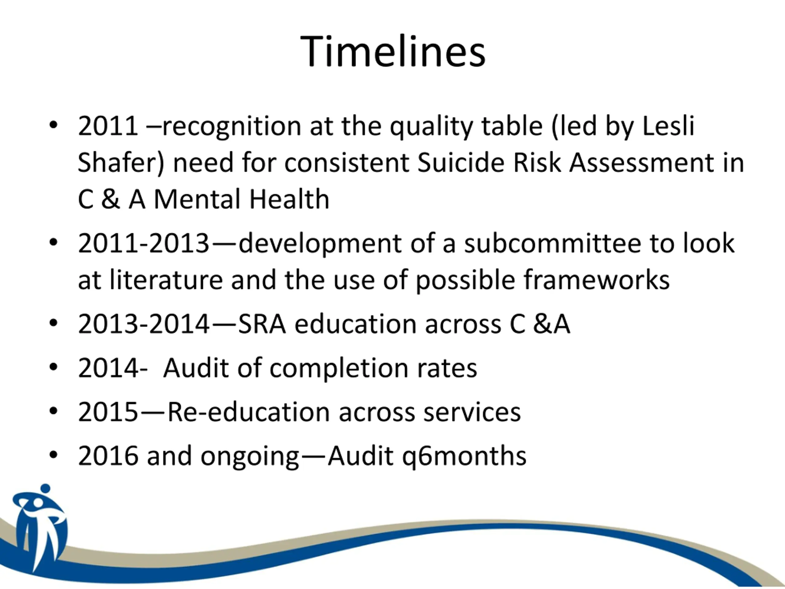 Timelines 2011 recognition at the quality table (led by Lesli Shafer) need for consistent Suicide Risk Assessment in C & A Mental Health 2011-2013 development of a subcommittee to look at literature and the use of possible frameworks 2013-2014 SRA education across C &A 2014- Audit of completion rates 2015 Re-education across services 2016 and ongoing Audit q6months