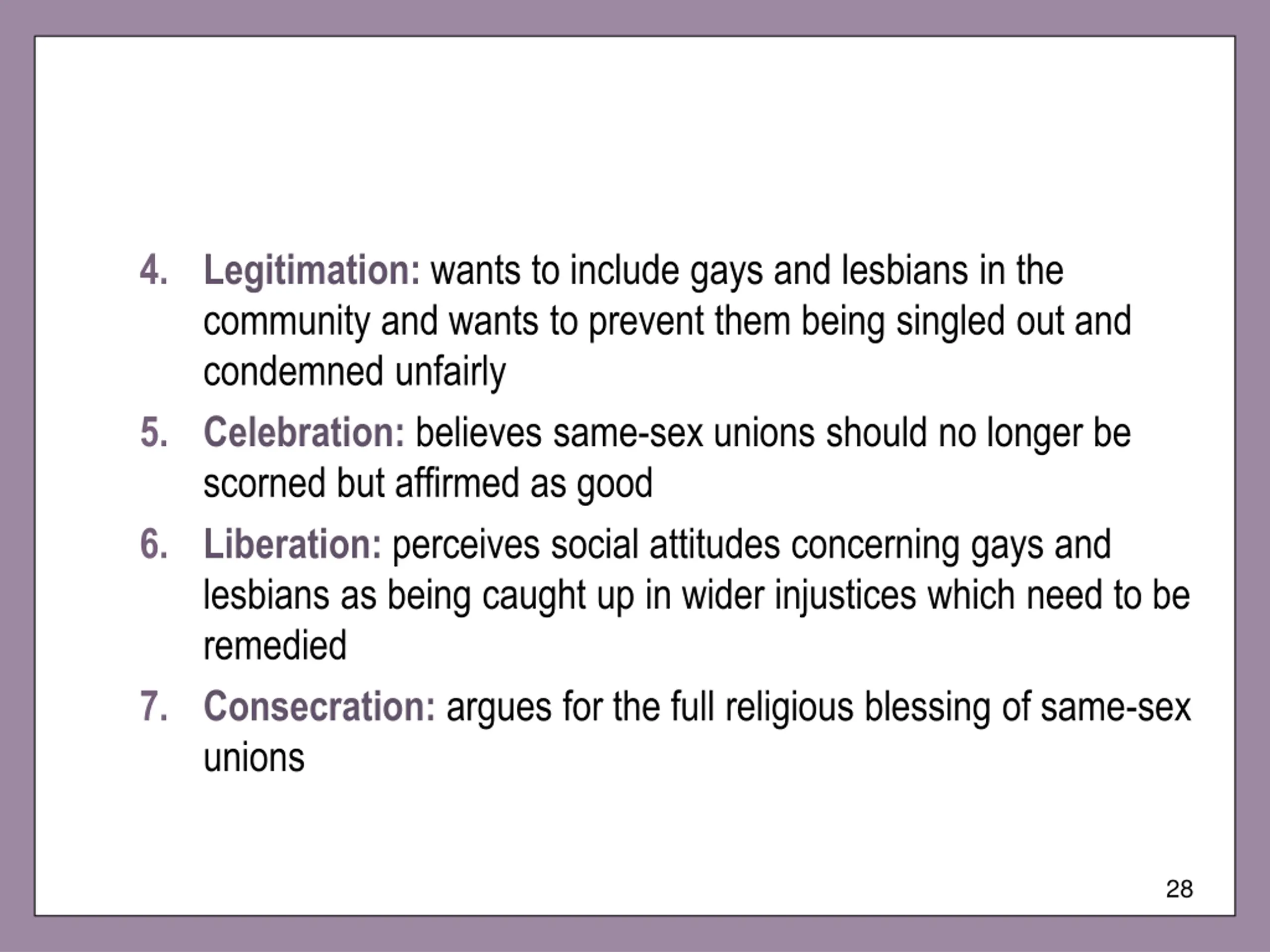 4. Legitimation: wants to include gays and lesbians in the community and wants to prevent them being singled out and condemned unfairly 5. Celebration: believes same-sex unions should no longer be scorned but affirmed as good 6. Liberation: perceives social attitudes concerning gays and lesbians as being caught up in wider injustices which need to be remedied 7. Consecration: argues for the full religious blessing of same-sex unions 28