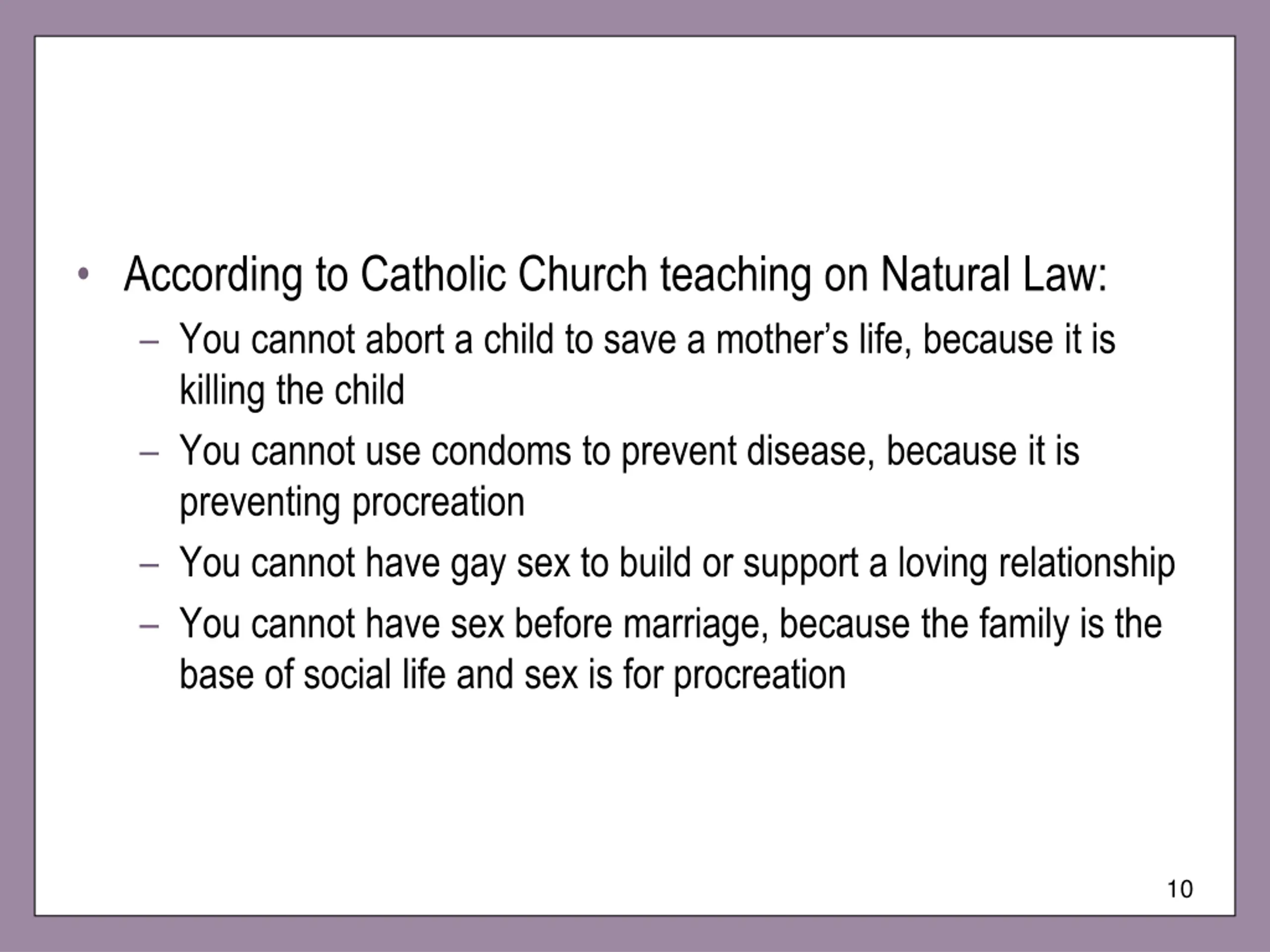 According to Catholic Church teaching on Natural Law: You cannot abort a child to save a mother s life, because it is killing the child You cannot use condoms to prevent disease, because it is preventing procreation You cannot have gay sex to build or support a loving relationship You cannot have sex before marriage, because the family is the base of social life and sex is for procreation 10