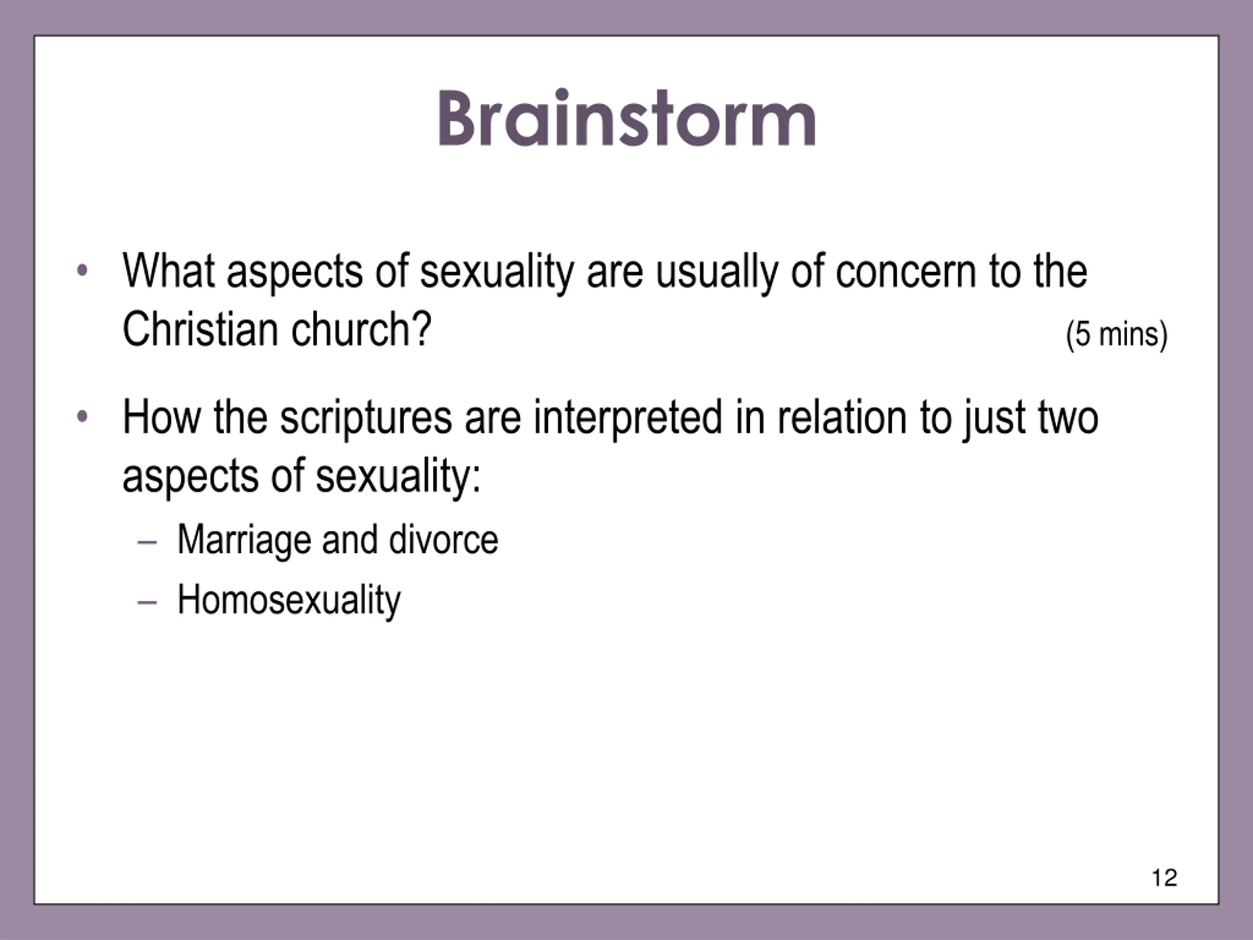 Brainstorm What aspects of sexuality are usually of concern to the Christian church? (5 mins) How the scriptures are interpreted in relation to just two aspects of sexuality: Marriage and divorce Homosexuality 12