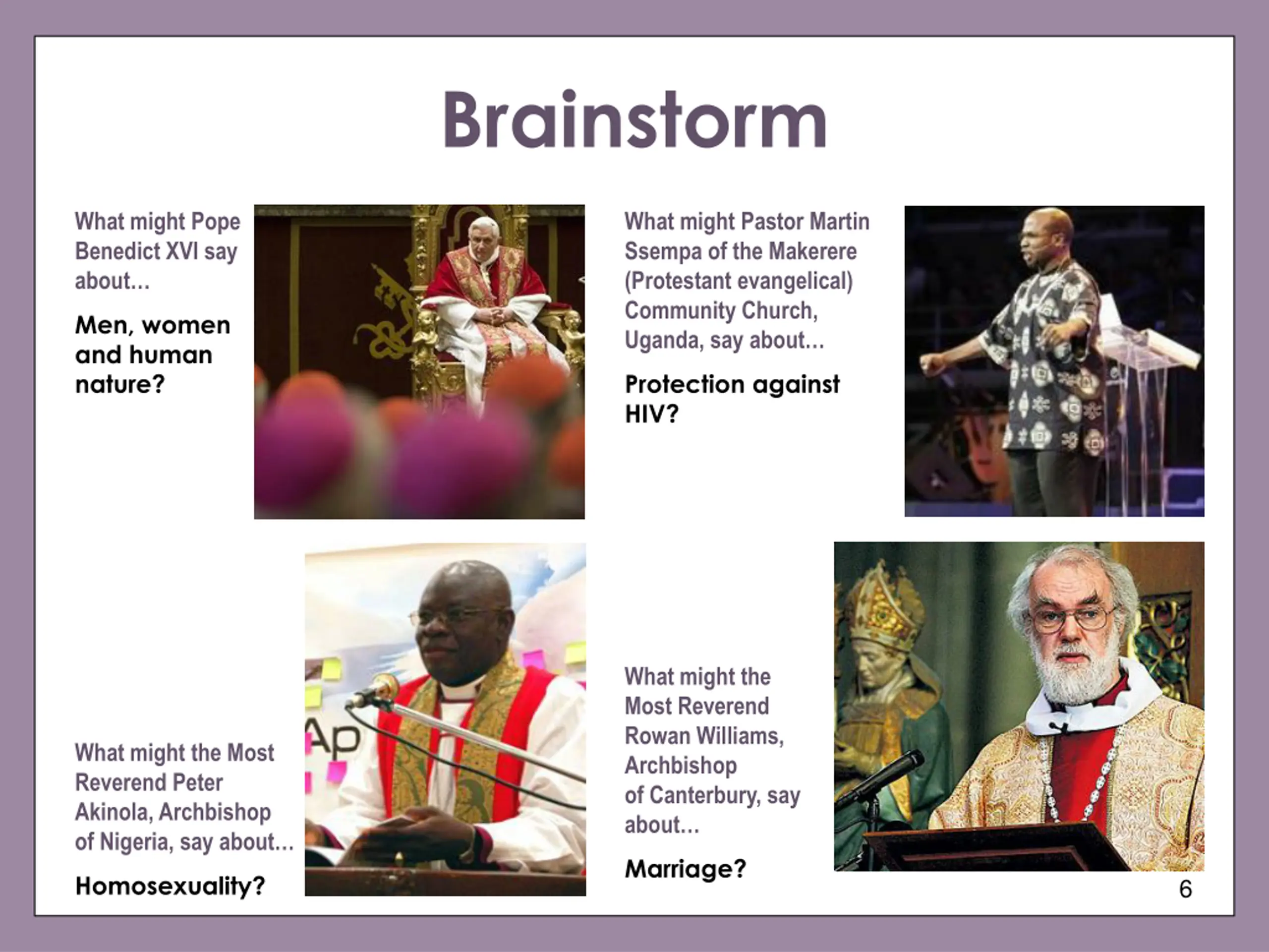 Brainstorm _mg_9761 What might Pope Benedict XVI say about What might Pastor Martin Ssempa of the Makerere (Protestant evangelical) Community Church, Uganda, say about Men, women and human nature? Protection against HIV? What might the Most Reverend Rowan Williams, Archbishop of Canterbury, say about What might the Most Reverend Peter Akinola, Archbishop of Nigeria, say about Marriage? Homosexuality? 6