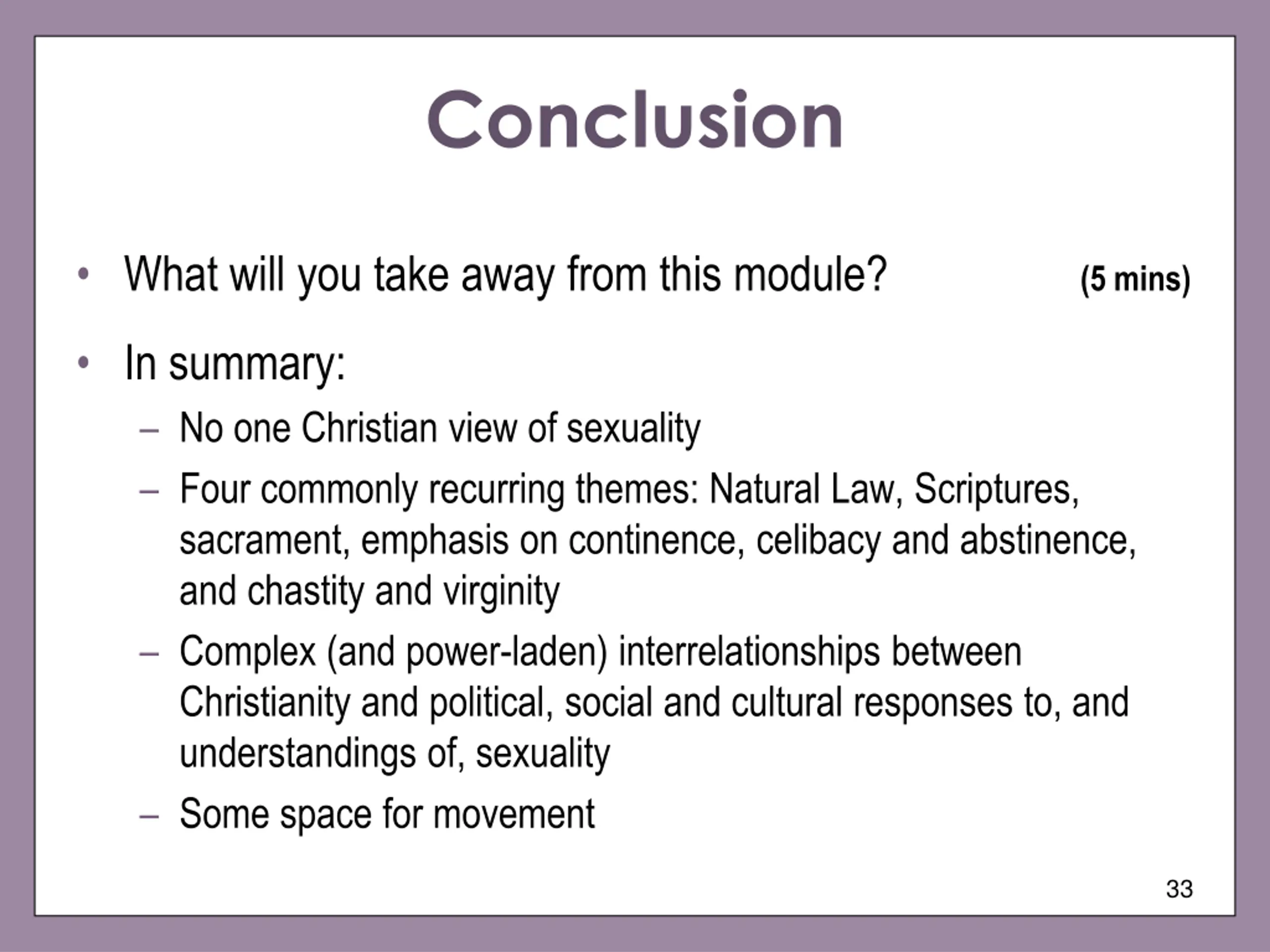 Conclusion What will you take away from this module? (5 mins) In summary: No one Christian view of sexuality Four commonly recurring themes: Natural Law, Scriptures, sacrament, emphasis on continence, celibacy and abstinence, and chastity and virginity Complex (and power-laden) interrelationships between Christianity and political, social and cultural responses to, and understandings of, sexuality Some space for movement 33