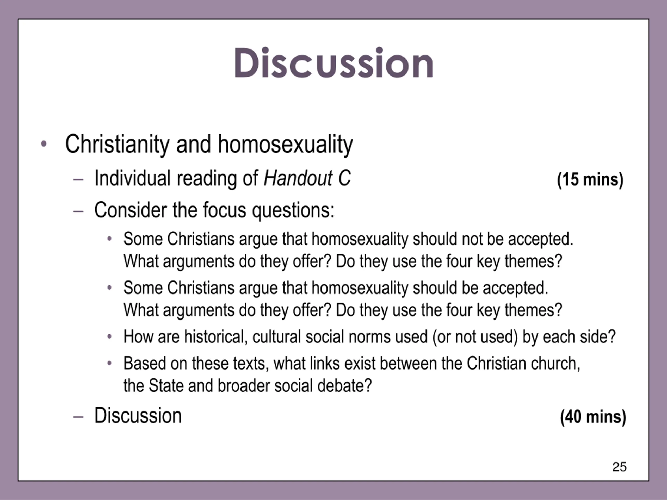Discussion Christianity and homosexuality Individual reading of Handout C(15 mins) Consider the focus questions: Some Christians argue that homosexuality should not be accepted. What arguments do they offer? Do they use the four key themes? Some Christians argue that homosexuality should be accepted. What arguments do they offer? Do they use the four key themes? How are historical, cultural social norms used (or not used) by each side? Based on these texts, what links exist between the Christian church, the State and broader social debate? Discussion (40 mins) 25