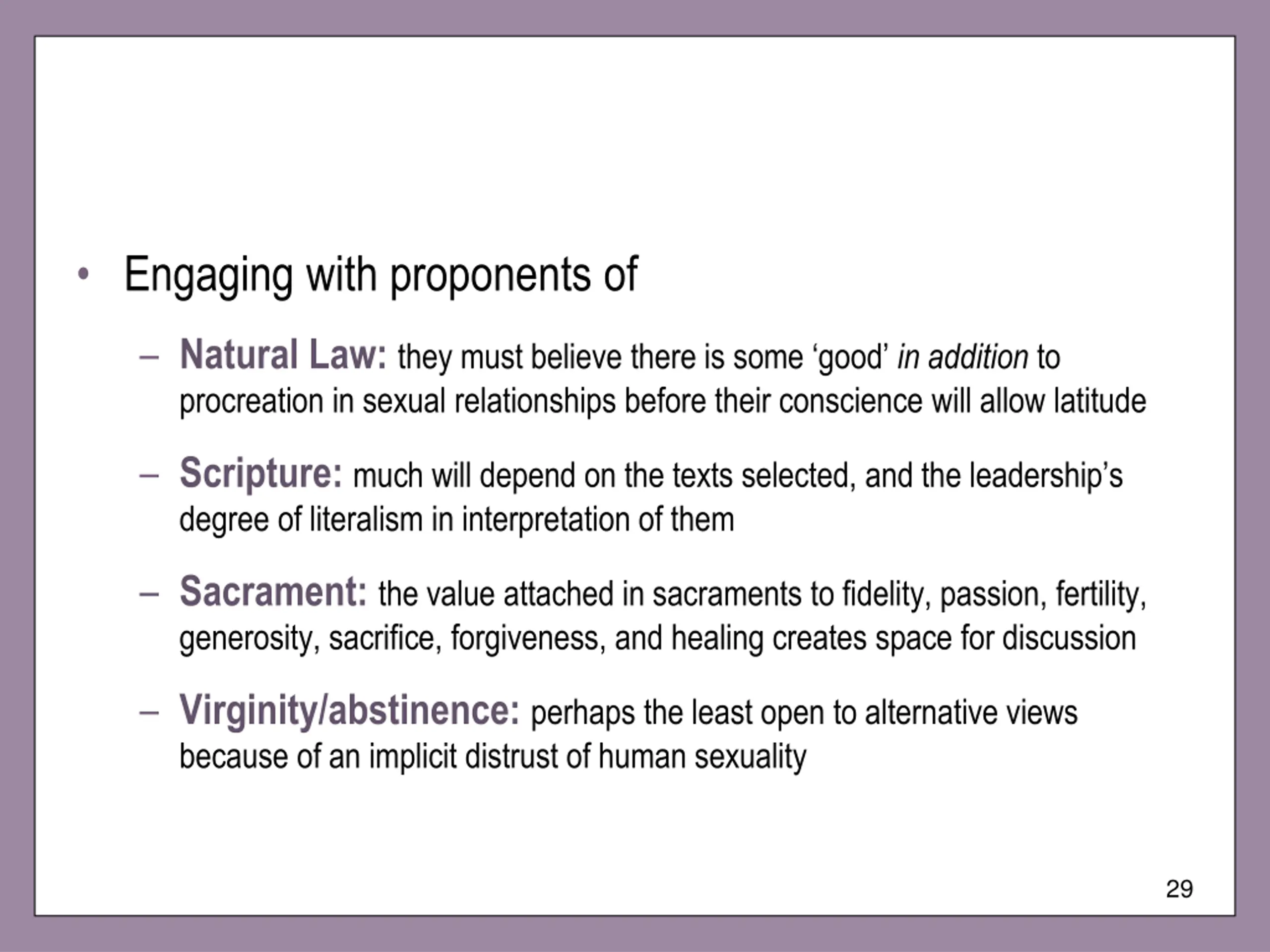 Engaging with proponents of Natural Law: they must believe there is some good in addition to procreation in sexual relationships before their conscience will allow latitude Scripture: much will depend on the texts selected, and the leadership s degree of literalism in interpretation of them Sacrament:the value attached in sacraments to fidelity, passion, fertility, generosity, sacrifice, forgiveness, and healing creates space for discussion Virginity/abstinence: perhaps the least open to alternative views because of an implicit distrust of human sexuality 29