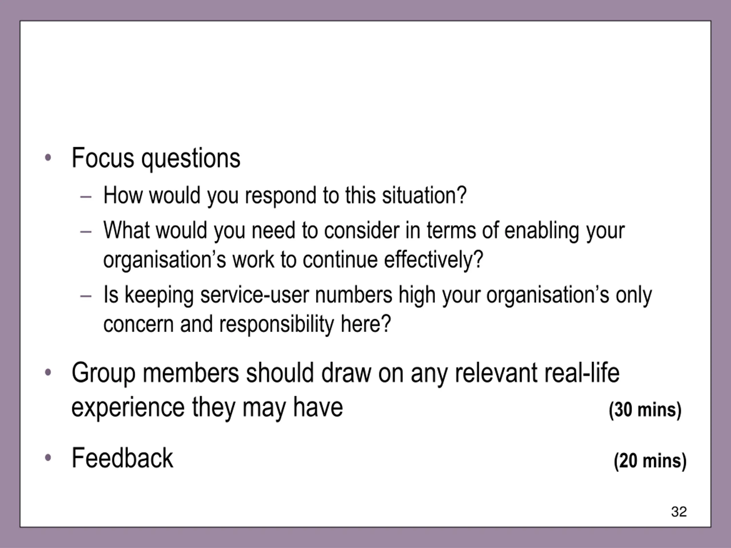 Focus questions How would you respond to this situation? What would you need to consider in terms of enabling your organisation s work to continue effectively? Is keeping service-user numbers high your organisation s only concern and responsibility here? Group members should draw on any relevant real-life experience they may have (30 mins) Feedback (20 mins) 32