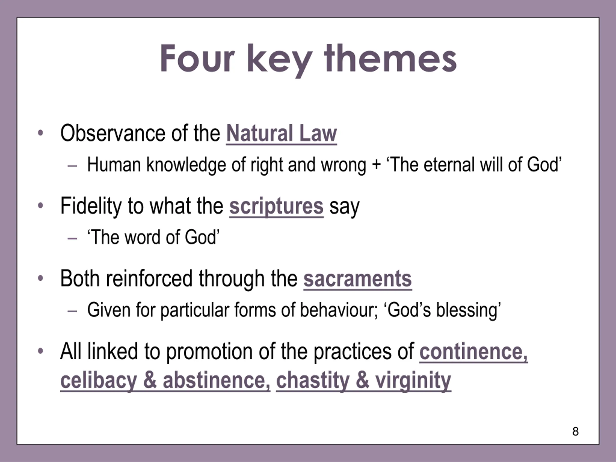 Four key themes Observance of the Natural Law Human knowledge of right and wrong + The eternal will of God Fidelity to what the scriptures say The word of God Both reinforced through the sacraments Given for particular forms of behaviour; God s blessing All linked to promotion of the practices of continence, celibacy & abstinence, chastity & virginity 8
