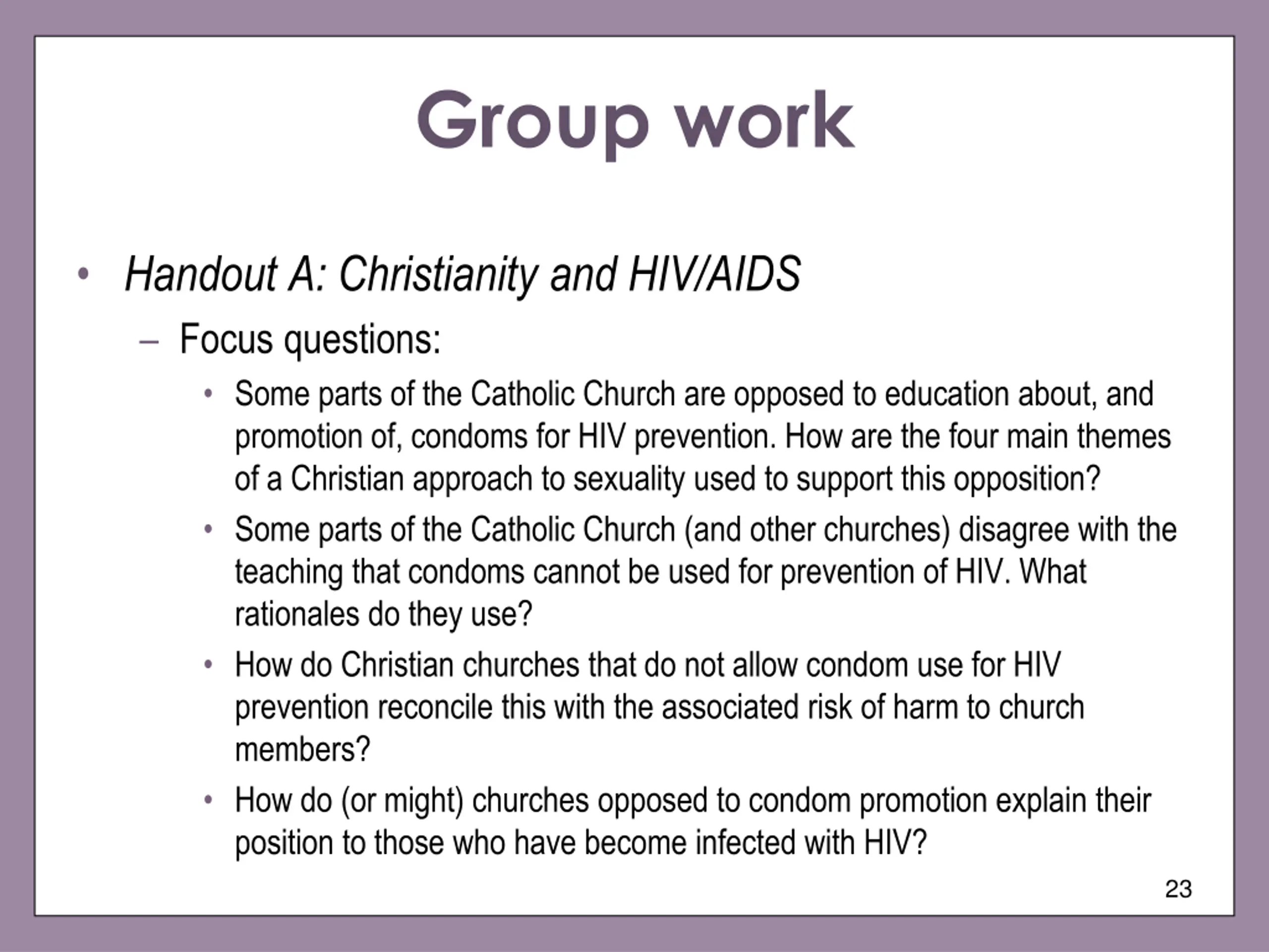 Group work Handout A: Christianity and HIV/AIDS Focus questions: Some parts of the Catholic Church are opposed to education about, and promotion of, condoms for HIV prevention. How are the four main themes of a Christian approach to sexuality used to support this opposition? Some parts of the Catholic Church (and other churches) disagree with the teaching that condoms cannot be used for prevention of HIV. What rationales do they use? How do Christian churches that do not allow condom use for HIV prevention reconcile this with the associated risk of harm to church members? How do (or might) churches opposed to condom promotion explain their position to those who have become infected with HIV? 23