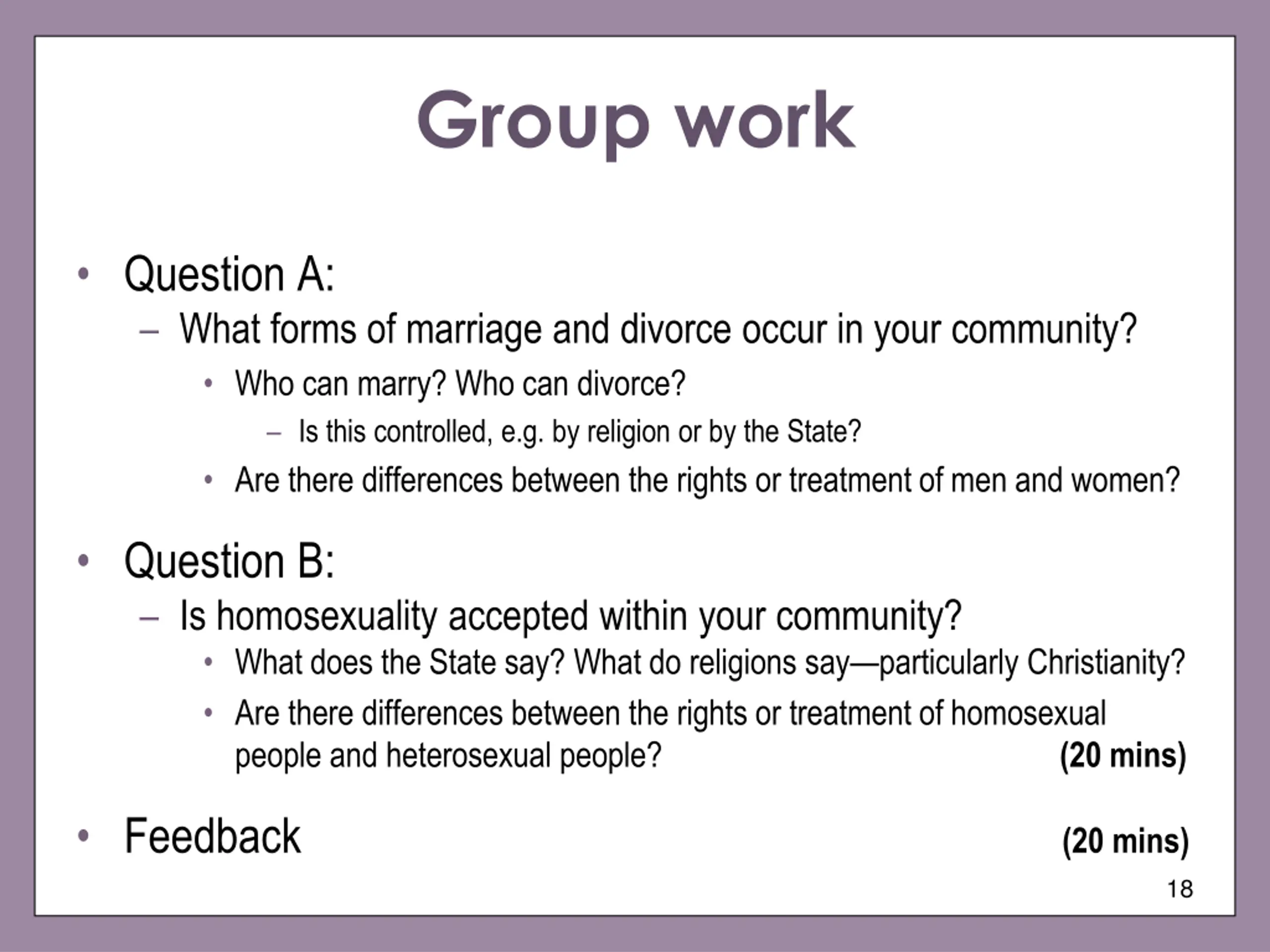 Group work Question A: What forms of marriage and divorce occur in your community? Who can marry? Who can divorce? Is this controlled, e.g. by religion or by the State? Are there differences between the rights or treatment of men and women? Question B: Is homosexuality accepted within your community? What does the State say? What do religions say particularly Christianity? Are there differences between the rights or treatment of homosexual people and heterosexual people? (20 mins) Feedback (20 mins) 18