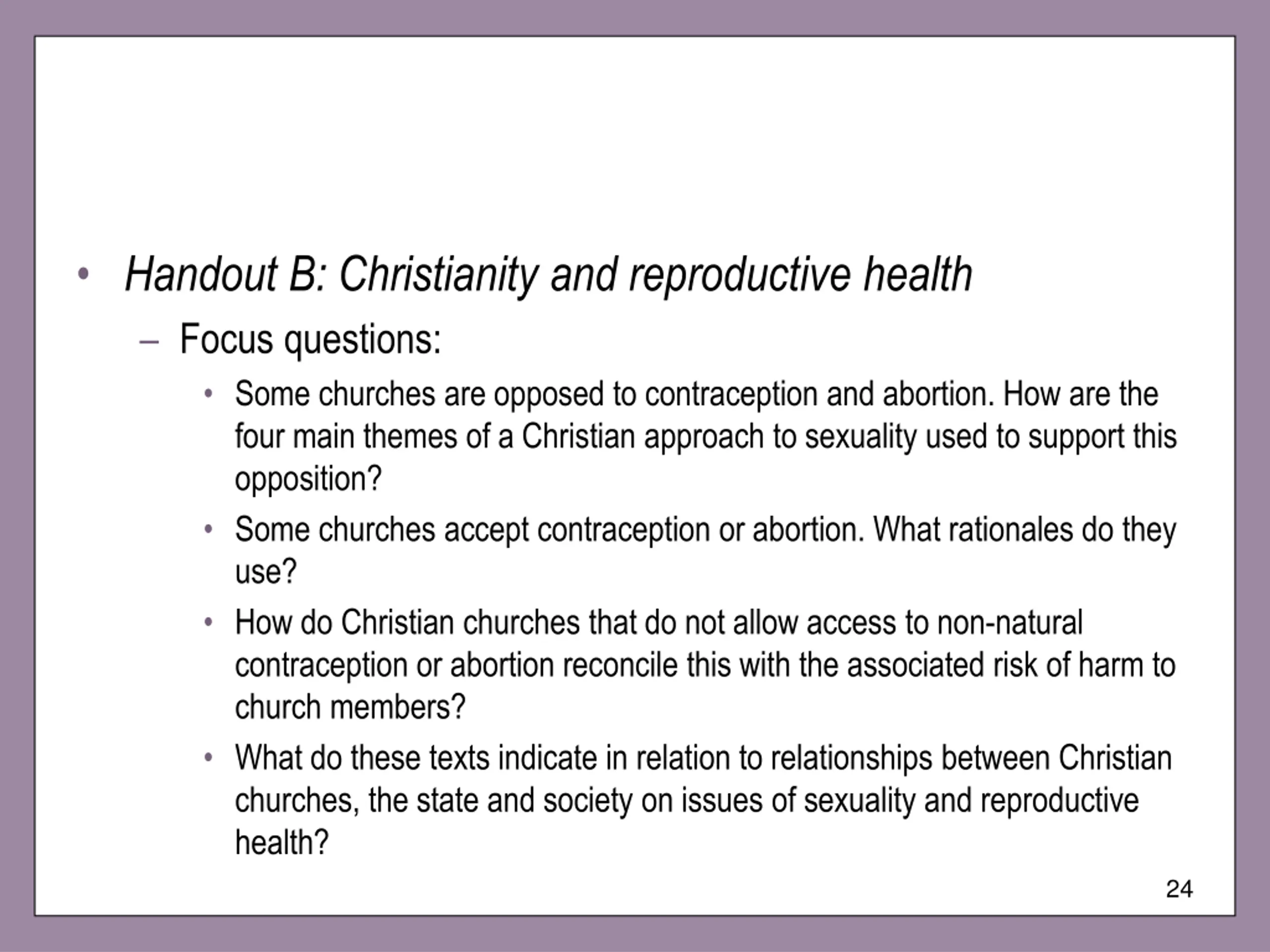 Handout B: Christianity and reproductive health Focus questions: Some churches are opposed to contraception and abortion. How are the four main themes of a Christian approach to sexuality used to support this opposition? Some churches accept contraception or abortion. What rationales do they use? How do Christian churches that do not allow access to non-natural contraception or abortion reconcile this with the associated risk of harm to church members? What do these texts indicate in relation to relationships between Christian churches, the state and society on issues of sexuality and reproductive health? 24