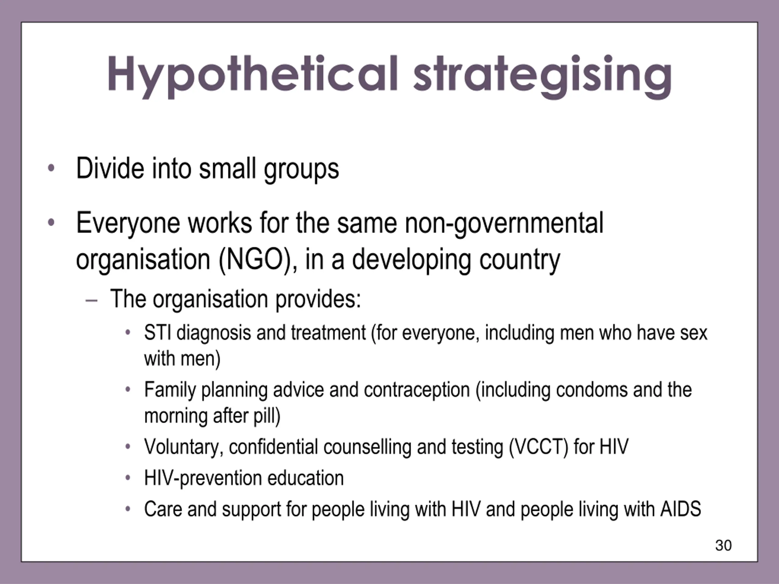 Hypothetical strategising Divide into small groups Everyone works for the same non-governmental organisation (NGO), in a developing country The organisation provides: STI diagnosis and treatment (for everyone, including men who have sex with men) Family planning advice and contraception (including condoms and the morning after pill) Voluntary, confidential counselling and testing (VCCT) for HIV HIV-prevention education Care and support for people living with HIV and people living with AIDS 30