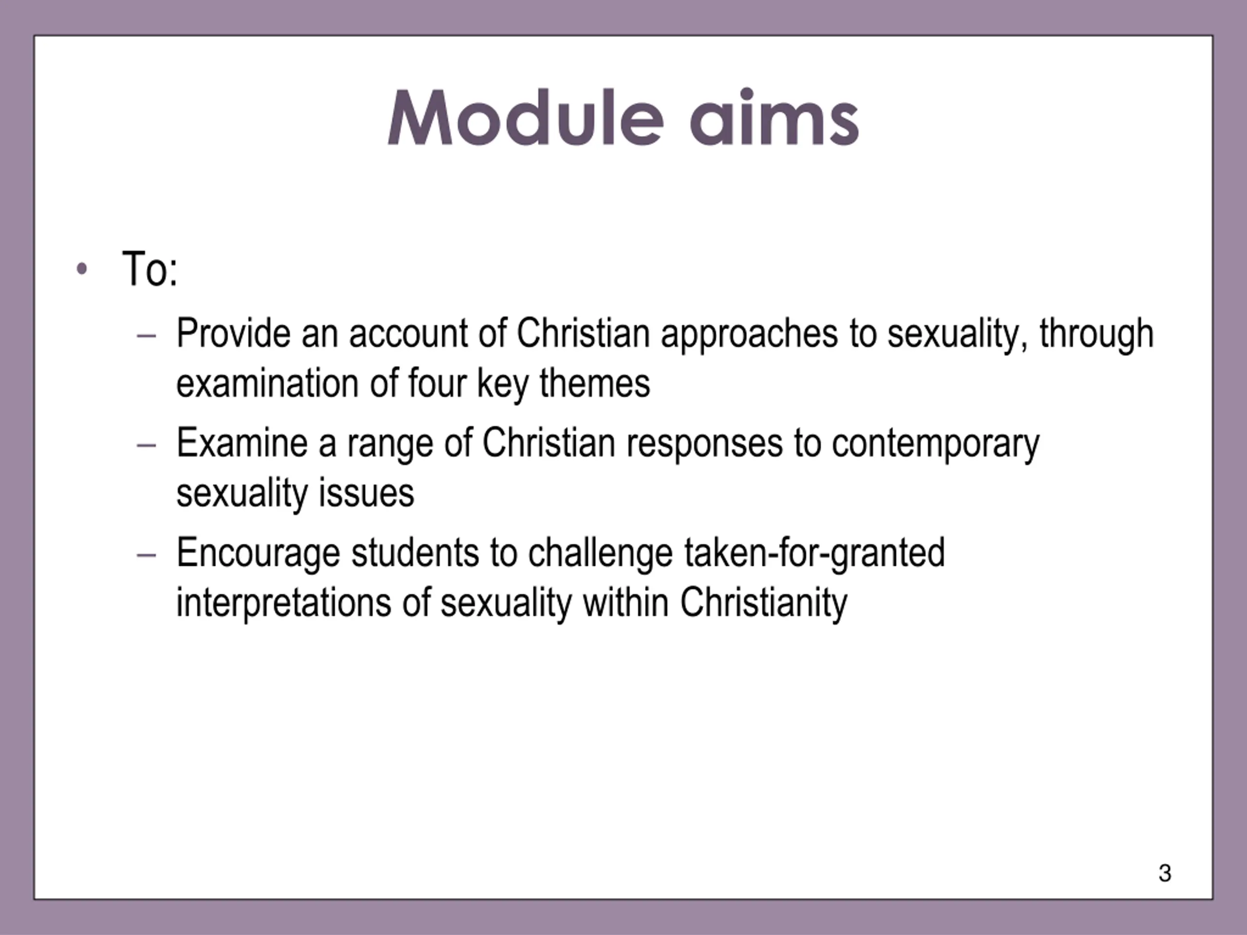 Module aims To: Provide an account of Christian approaches to sexuality, through examination of four key themes Examine a range of Christian responses to contemporary sexuality issues Encourage students to challenge taken-for-granted interpretations of sexuality within Christianity 3
