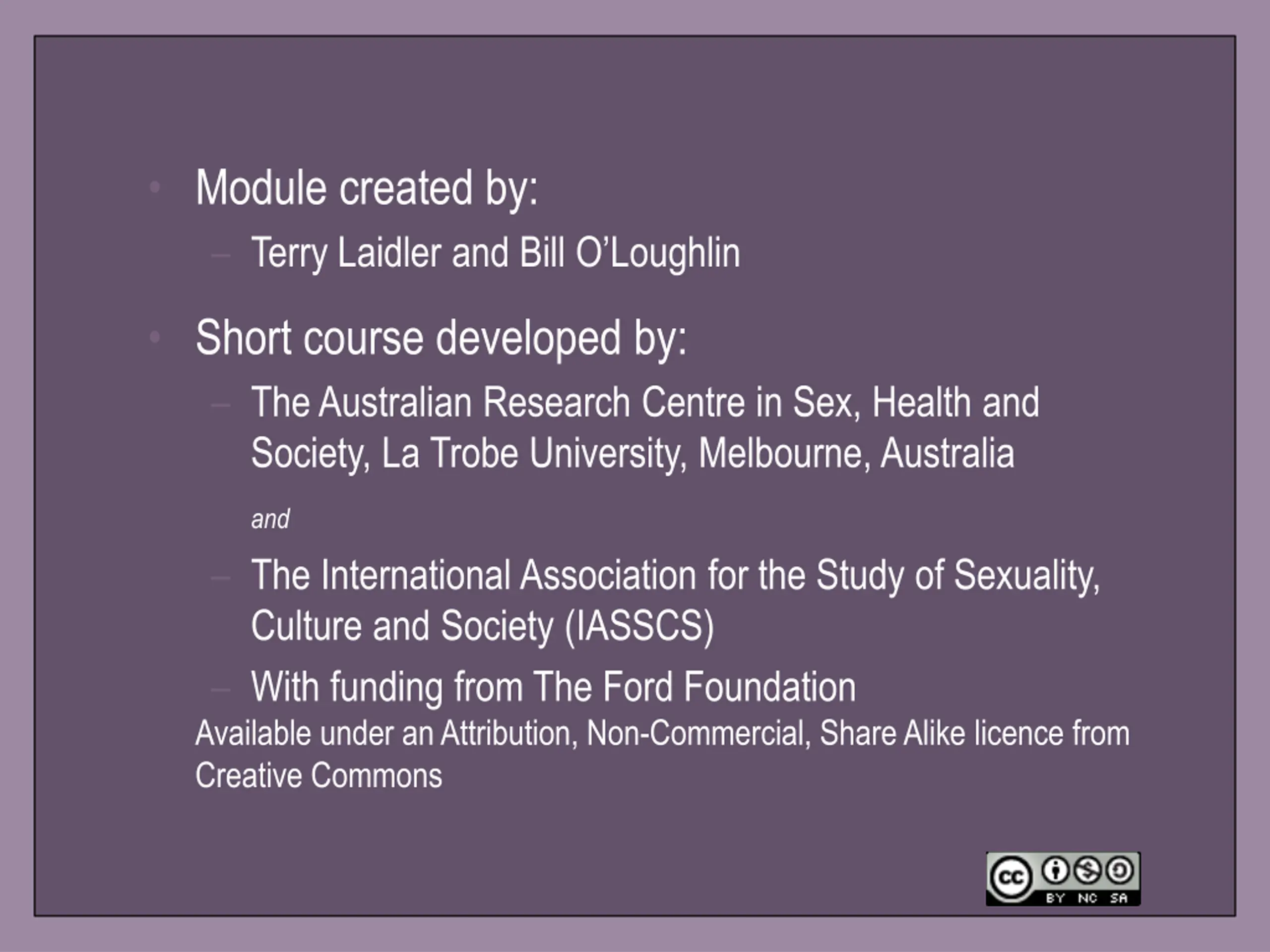 Module created by: Terry Laidler and Bill O Loughlin Short course developed by: The Australian Research Centre in Sex, Health and Society, La Trobe University, Melbourne, Australia The International Association for the Study of Sexuality, Culture and Society (IASSCS) With funding from The Ford Foundation Available under an Attribution, Non-Commercial, Share Alike licence from Creative Commons and 34