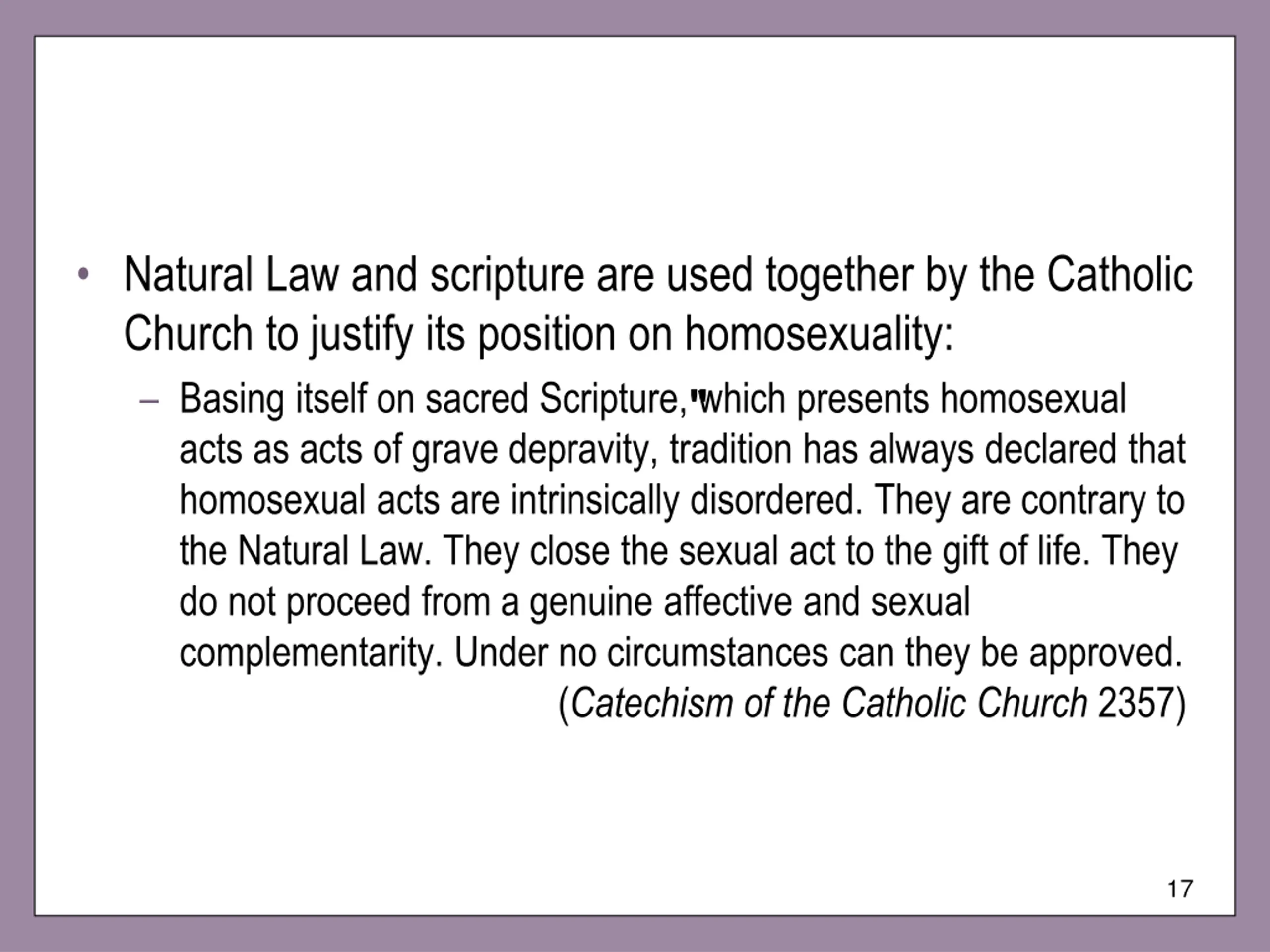 Natural Law and scripture are used together by the Catholic Church to justify its position on homosexuality: Basing itself on sacred Scripture, which presents homosexual acts as acts of grave depravity, tradition has always declared that homosexual acts are intrinsically disordered. They are contrary to the Natural Law. They close the sexual act to the gift of life. They do not proceed from a genuine affective and sexual complementarity. Under no circumstances can they be approved. (Catechism of the Catholic Church 2357) " 17