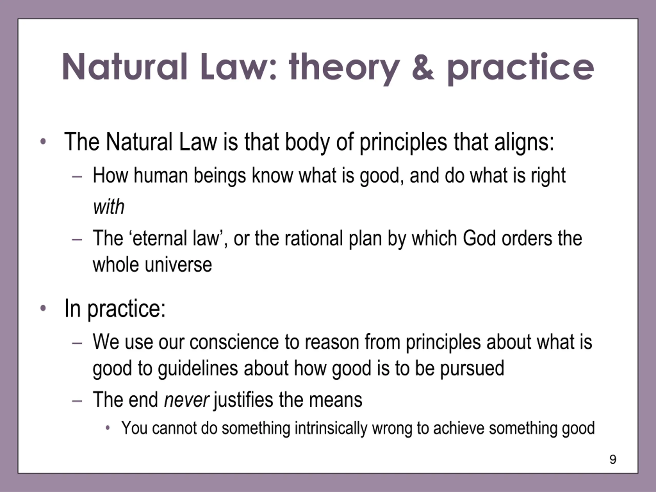 Natural Law: theory & practice The Natural Law is that body of principles that aligns: How human beings know what is good, and do what is right with The eternal law , or the rational plan by which God orders the whole universe In practice: We use our conscience to reason from principles about what is good to guidelines about how good is to be pursued The end never justifies the means You cannot do something intrinsically wrong to achieve something good 9
