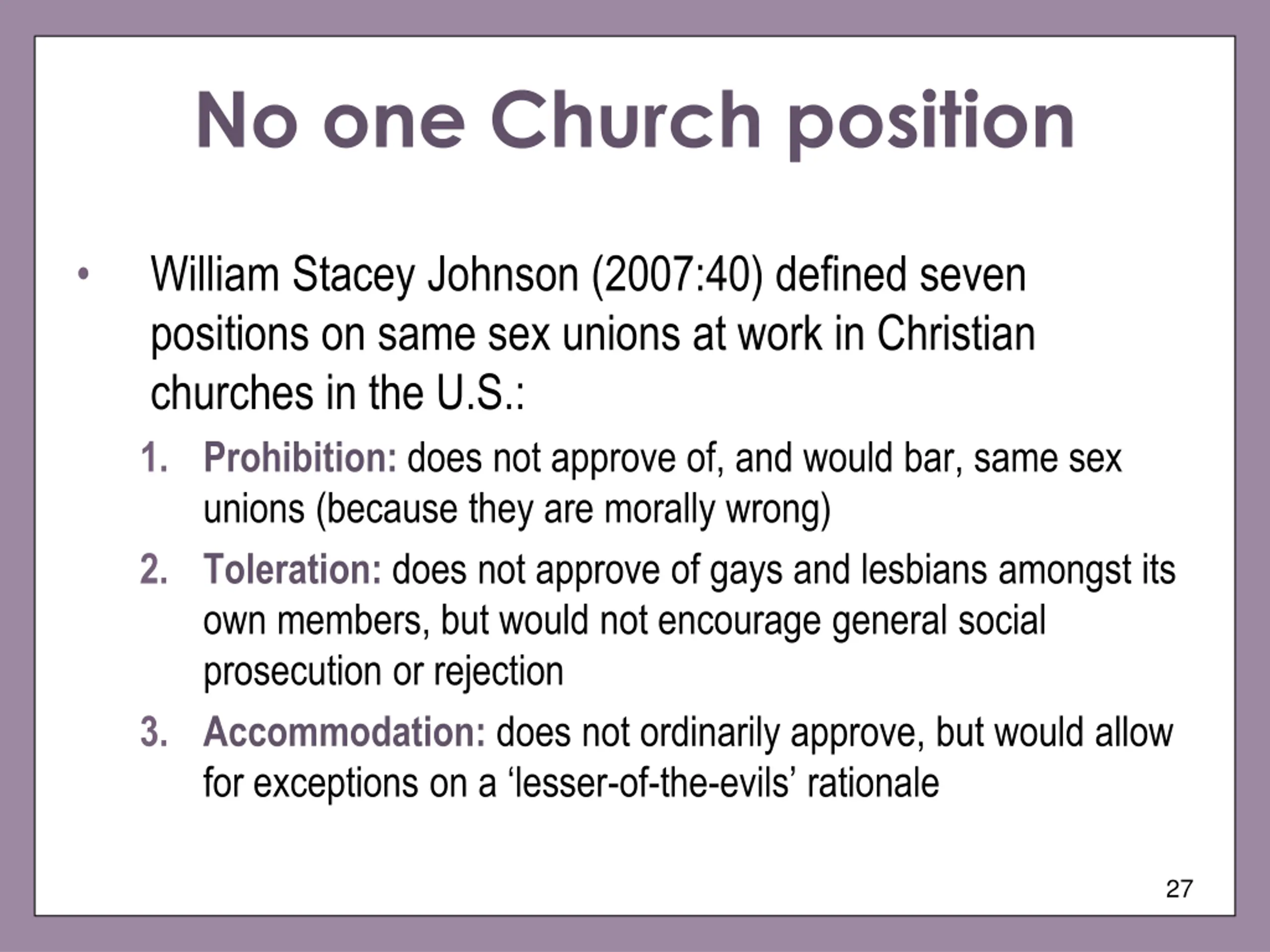 No one Church position William Stacey Johnson (2007:40) defined seven positions on same sex unions at work in Christian churches in the U.S.: 1. Prohibition: does not approve of, and would bar, same sex unions (because they are morally wrong) 2. Toleration: does not approve of gays and lesbians amongst its own members, but would not encourage general social prosecution or rejection 3. Accommodation: does not ordinarily approve, but would allow for exceptions on a lesser-of-the-evils rationale 27