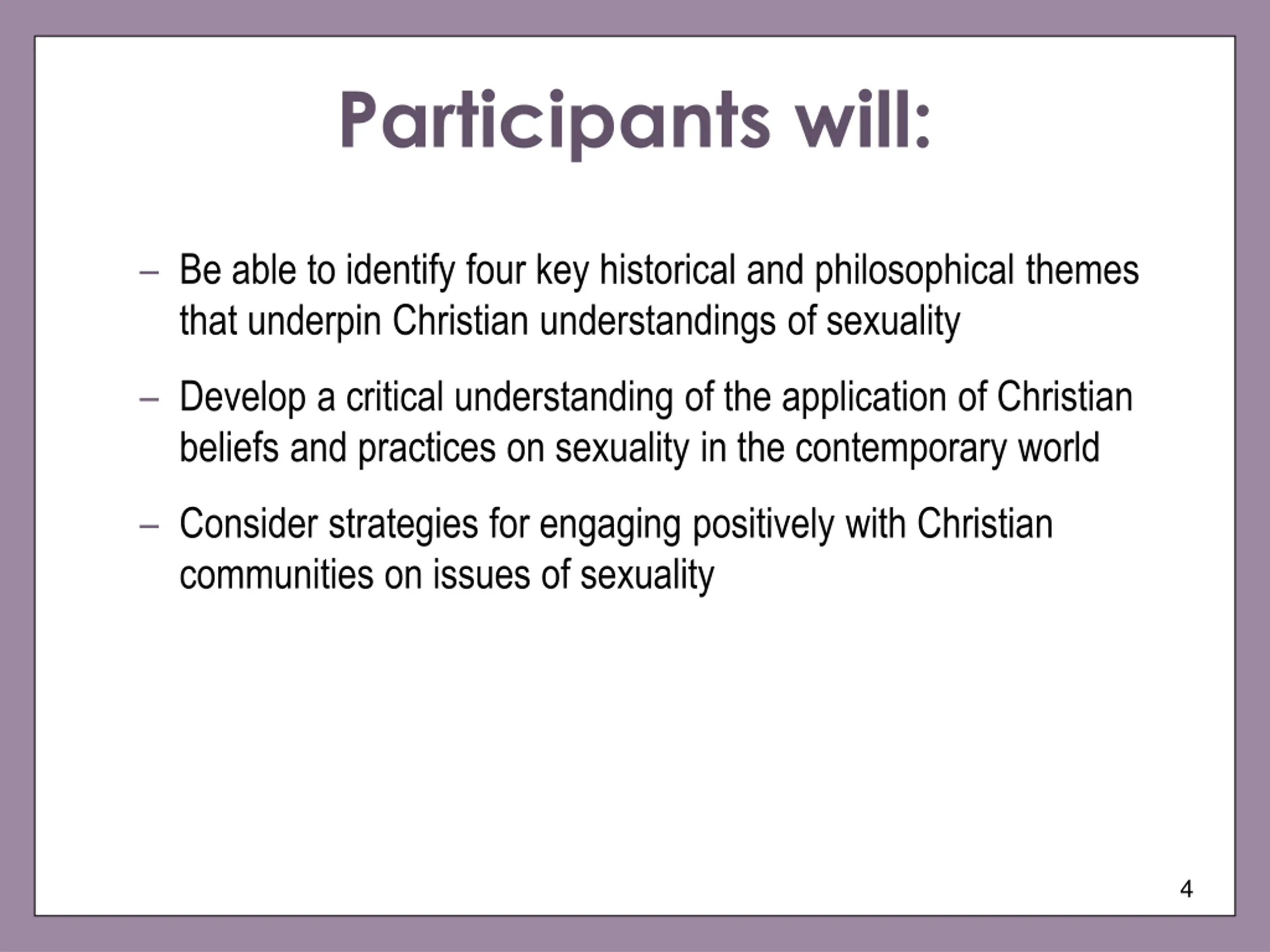 Participants will: Be able to identify four key historical and philosophical themes that underpin Christian understandings of sexuality Develop a critical understanding of the application of Christian beliefs and practices on sexuality in the contemporary world Consider strategies for engaging positively with Christian communities on issues of sexuality 4