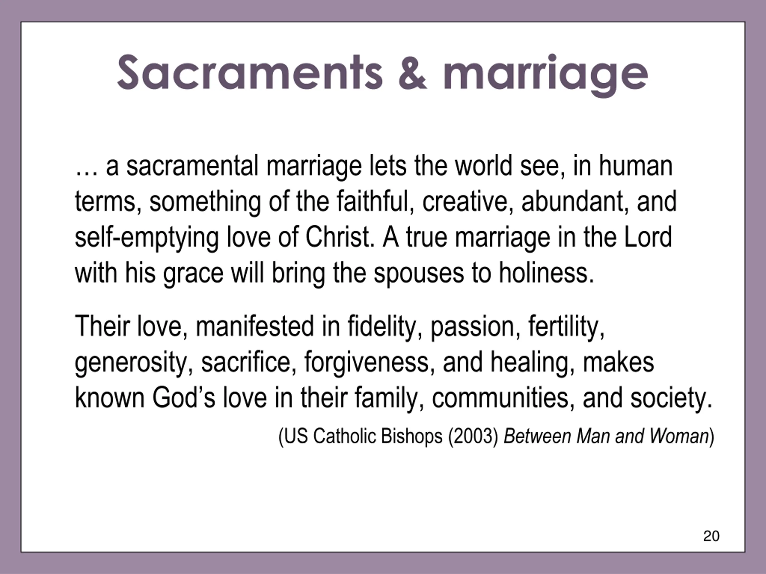 Sacraments & marriage a sacramental marriage lets the world see, in human terms, something of the faithful, creative, abundant, and self-emptying love of Christ. A true marriage in the Lord with his grace will bring the spouses to holiness. Their love, manifested in fidelity, passion, fertility, generosity, sacrifice, forgiveness, and healing, makes known God s love in their family, communities, and society. (US Catholic Bishops (2003) Between Man and Woman) 20