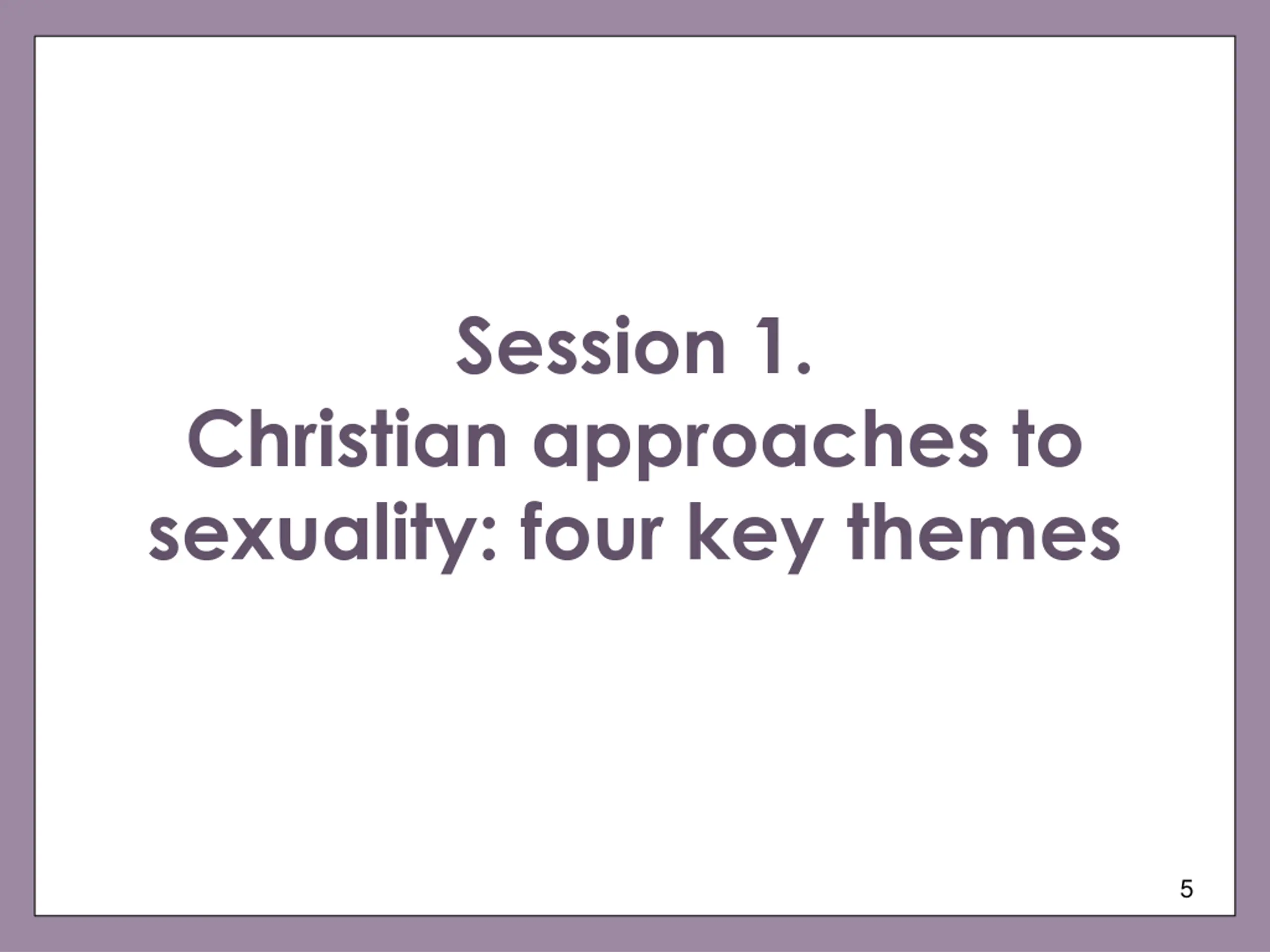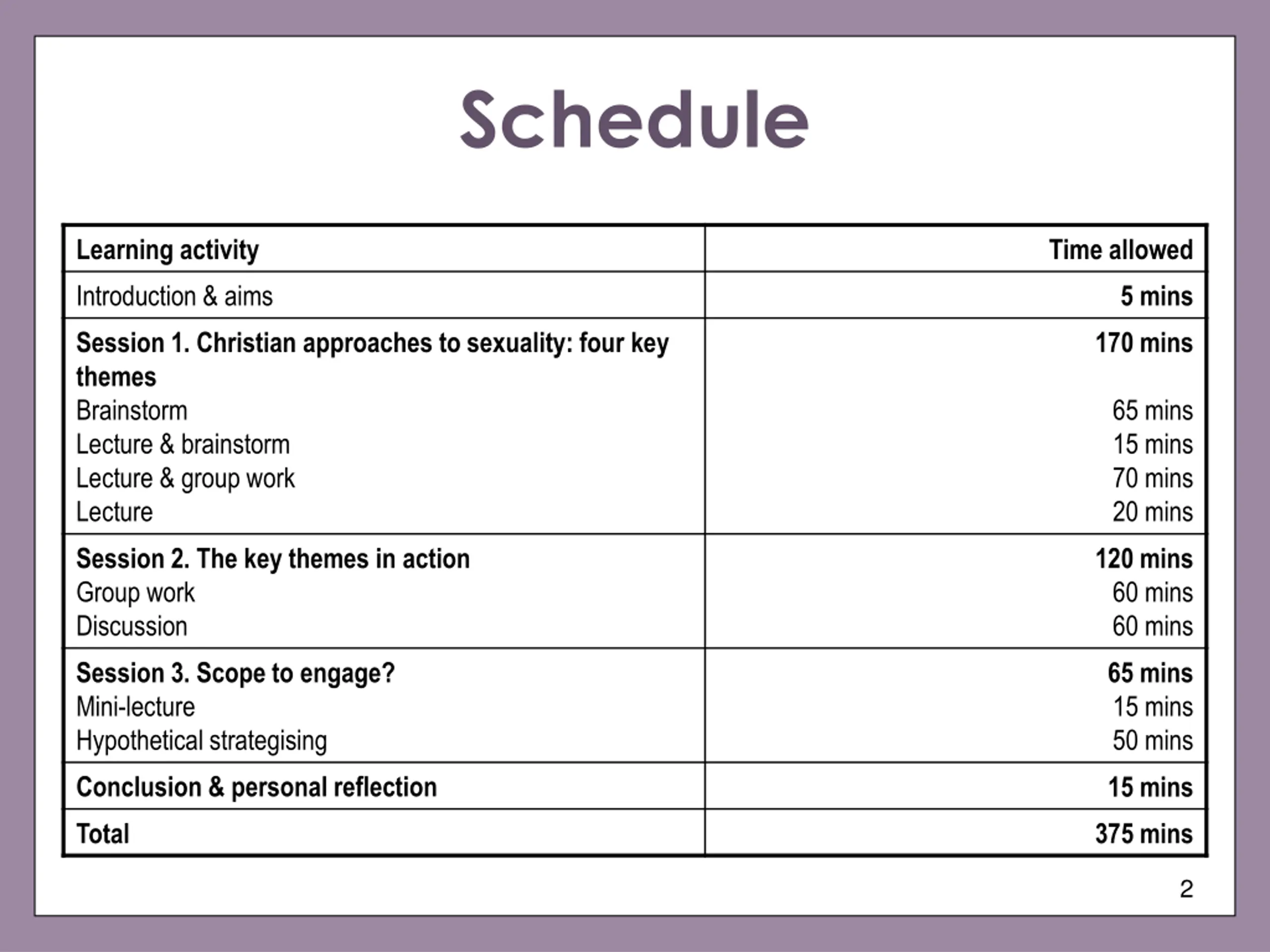 Schedule Learning activity Introduction & aims Time allowed 5 mins Session 1. Christian approaches to sexuality: four key themes Brainstorm Lecture & brainstorm Lecture & group work Lecture 170 mins 65 mins 15 mins 70 mins 20 mins Session 2. The key themes in action Group work Discussion 120 mins 60 mins 60 mins Session 3. Scope to engage? Mini-lecture Hypothetical strategising 65 mins 15 mins 50 mins Conclusion & personal reflection 15 mins Total 375 mins 2