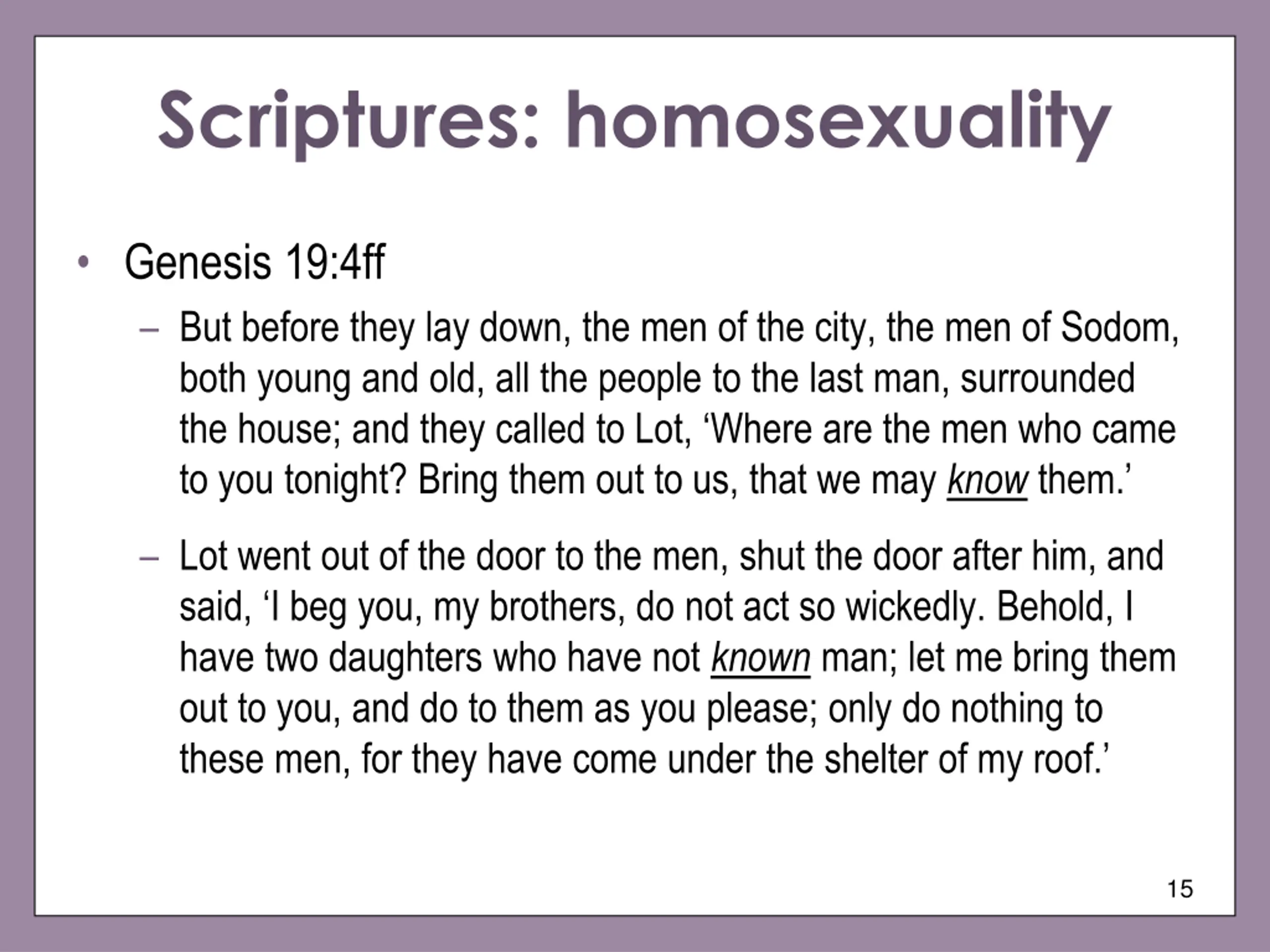 Scriptures: homosexuality Genesis 19:4ff But before they lay down, the men of the city, the men of Sodom, both young and old, all the people to the last man, surrounded the house; and they called to Lot, Where are the men who came to you tonight? Bring them out to us, that we may knowthem. Lot went out of the door to the men, shut the door after him, and said, I beg you, my brothers, do not act so wickedly. Behold, I have two daughters who have not known man; let me bring them out to you, and do to them as you please; only do nothing to these men, for they have come under the shelter of my roof. 15