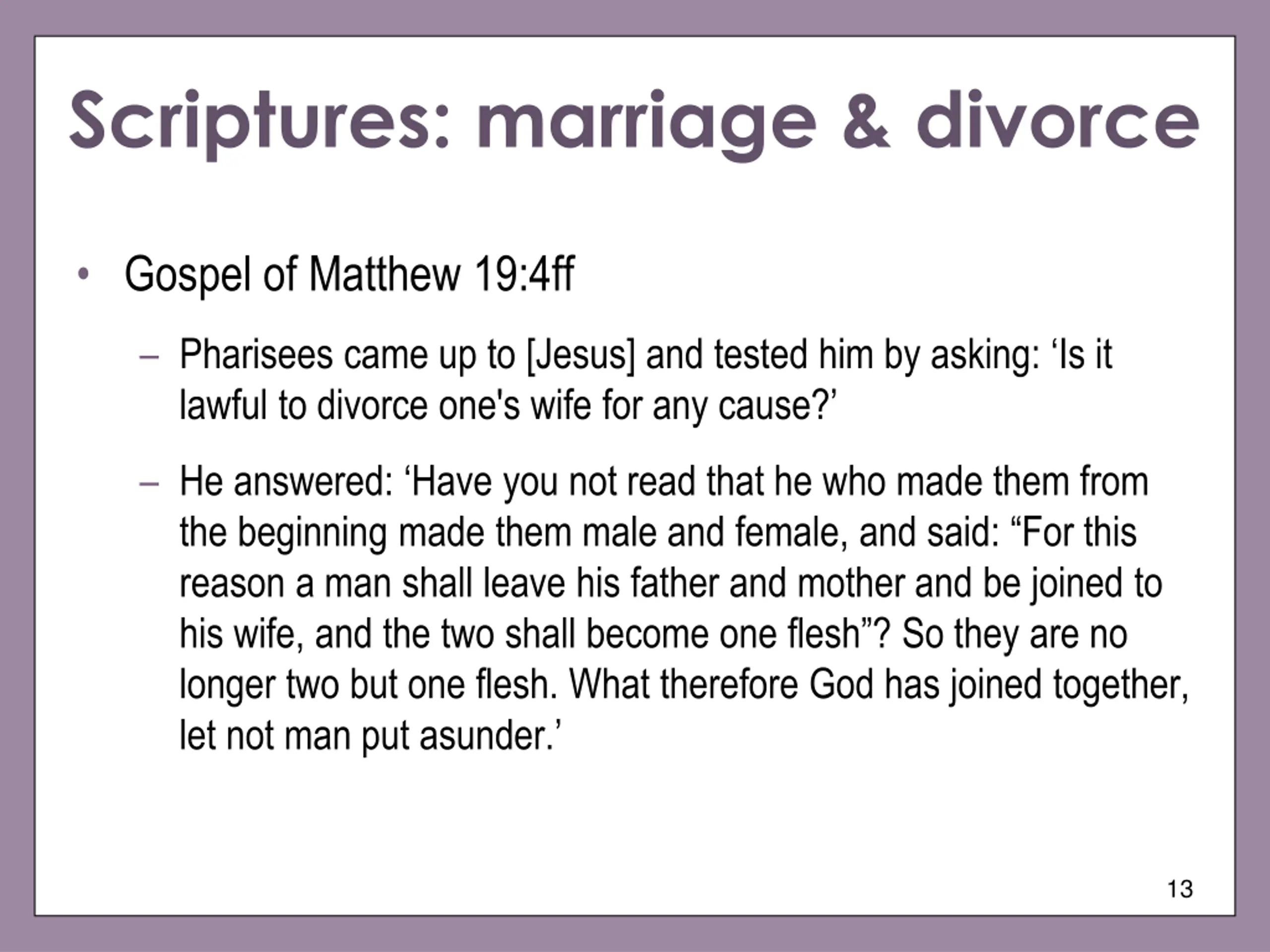 Scriptures: marriage & divorce Gospel of Matthew 19:4ff Pharisees came up to [Jesus] and tested him by asking: Is it lawful to divorce one's wife for any cause? He answered: Have you not read that he who made them from the beginning made them male and female, and said: For this reason a man shall leave his father and mother and be joined to his wife, and the two shall become one flesh ? So they are no longer two but one flesh. What therefore God has joined together, let not man put asunder. 13