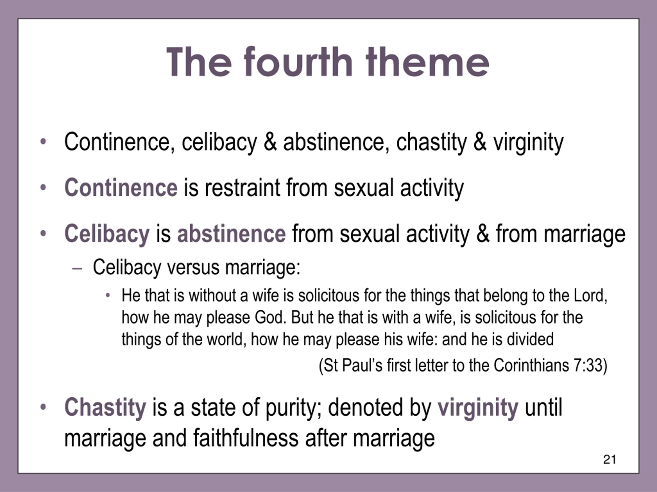 The fourth theme Continence, celibacy & abstinence, chastity & virginity Continence is restraint from sexual activity Celibacy is abstinence from sexual activity & from marriage Celibacy versus marriage: He that is without a wife is solicitous for the things that belong to the Lord, how he may please God. But he that is with a wife, is solicitous for the things of the world, how he may please his wife: and he is divided (St Paul s first letter to the Corinthians 7:33) Chastity is a state of purity; denoted by virginity until marriage and faithfulness after marriage 21