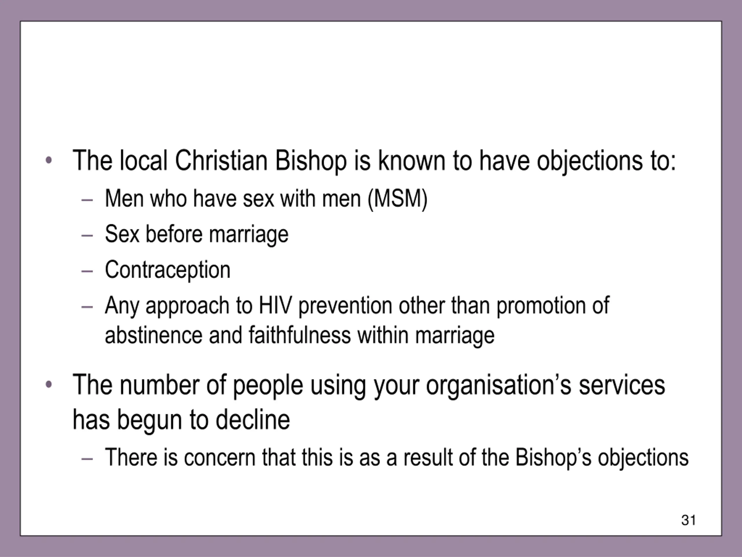 The local Christian Bishop is known to have objections to: Men who have sex with men (MSM) Sex before marriage Contraception Any approach to HIV prevention other than promotion of abstinence and faithfulness within marriage The number of people using your organisation s services has begun to decline There is concern that this is as a result of the Bishop s objections 31