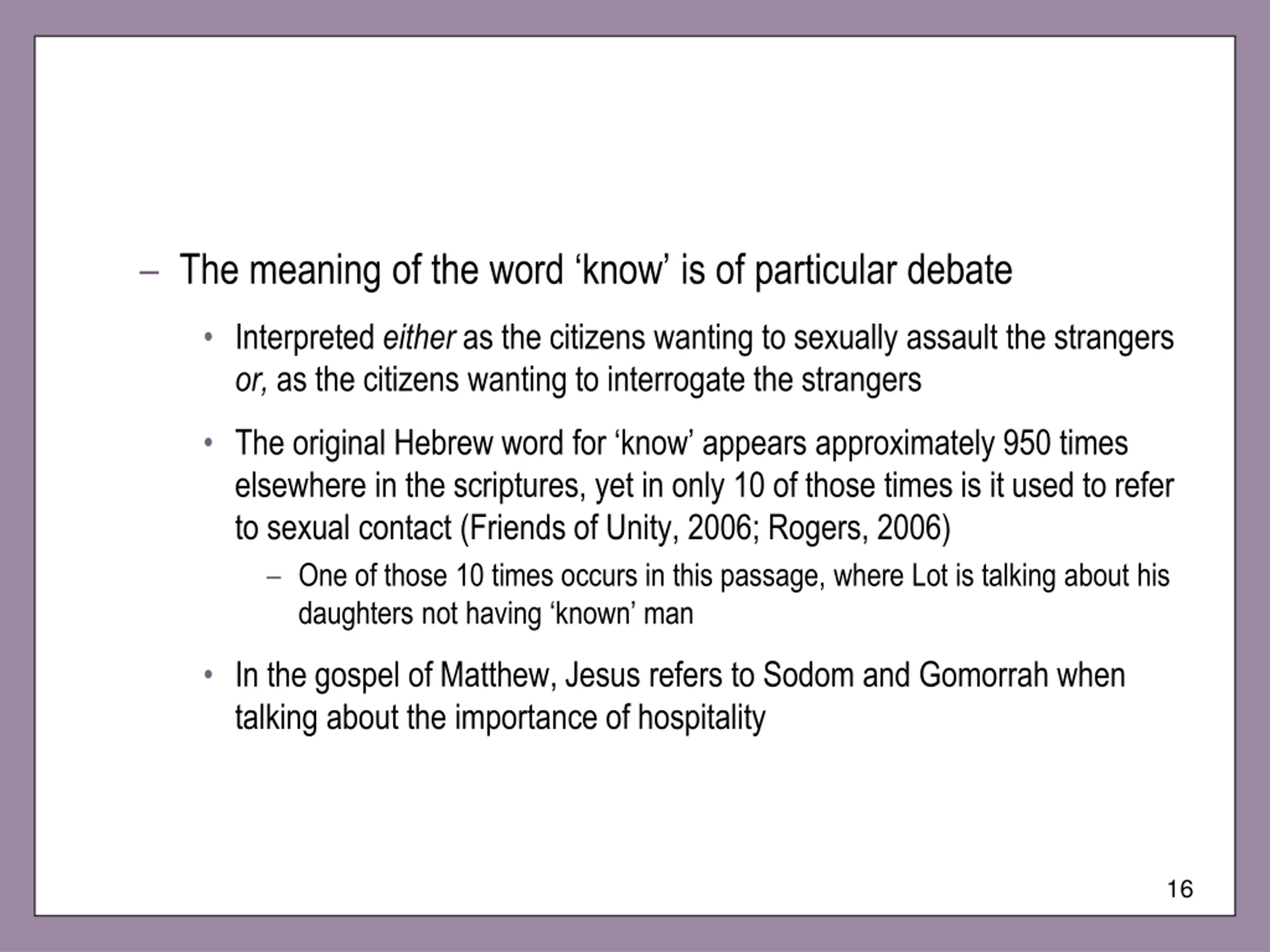 The meaning of the word know is of particular debate Interpreted either as the citizens wanting to sexually assault the strangers or, as the citizens wanting to interrogate the strangers The original Hebrew word for know appears approximately 950 times elsewhere in the scriptures, yet in only 10 of those times is it used to refer to sexual contact (Friends of Unity, 2006; Rogers, 2006) One of those 10 times occurs in this passage, where Lot is talking about his daughters not having known man In the gospel of Matthew, Jesus refers to Sodom and Gomorrah when talking about the importance of hospitality 16