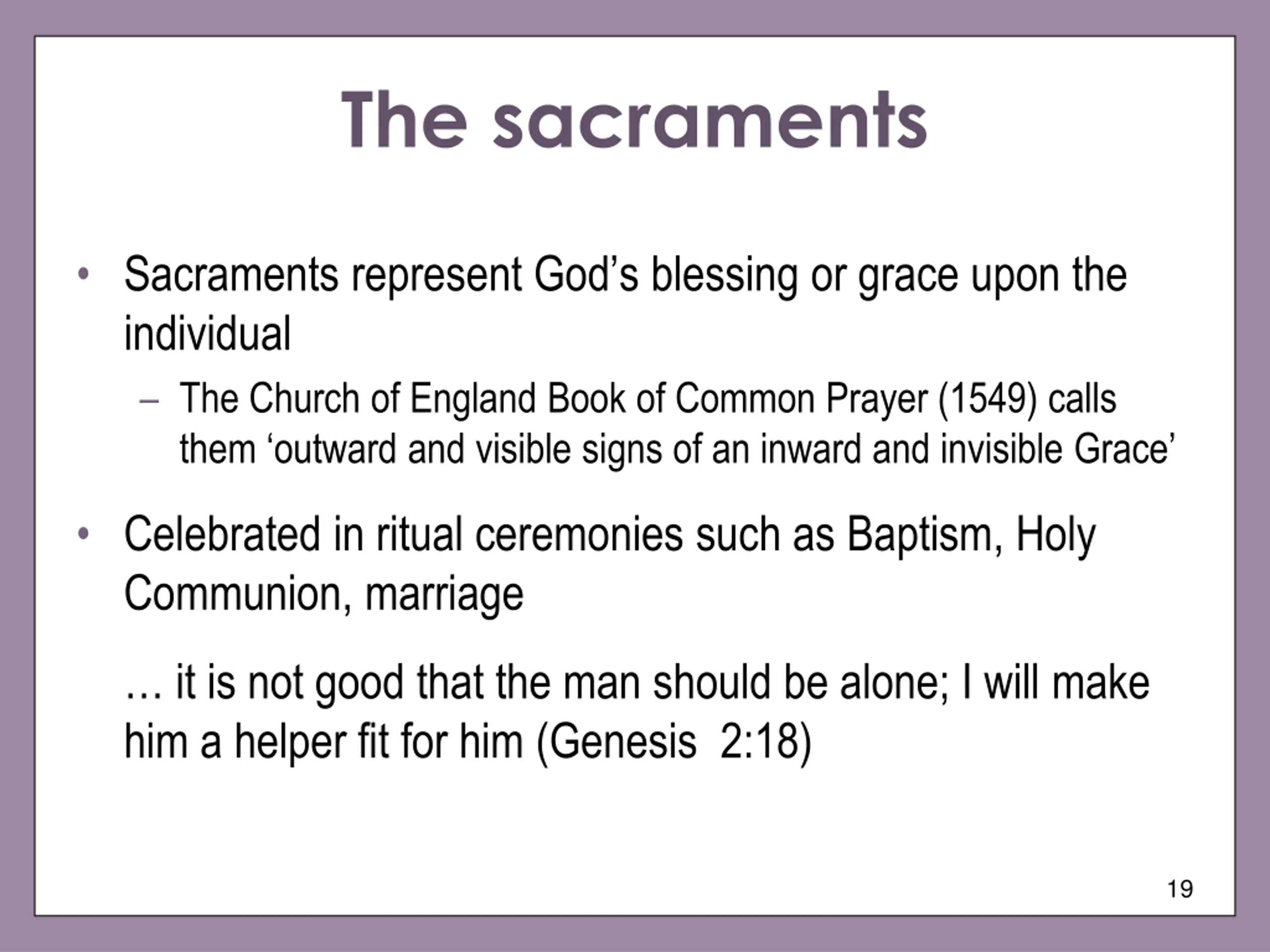 The sacraments Sacraments represent God s blessing or grace upon the individual The Church of England Book of Common Prayer (1549) calls them outward and visible signs of an inward and invisible Grace Celebrated in ritual ceremonies such as Baptism, Holy Communion, marriage it is not good that the man should be alone; I will make him a helper fit for him (Genesis 2:18) 19