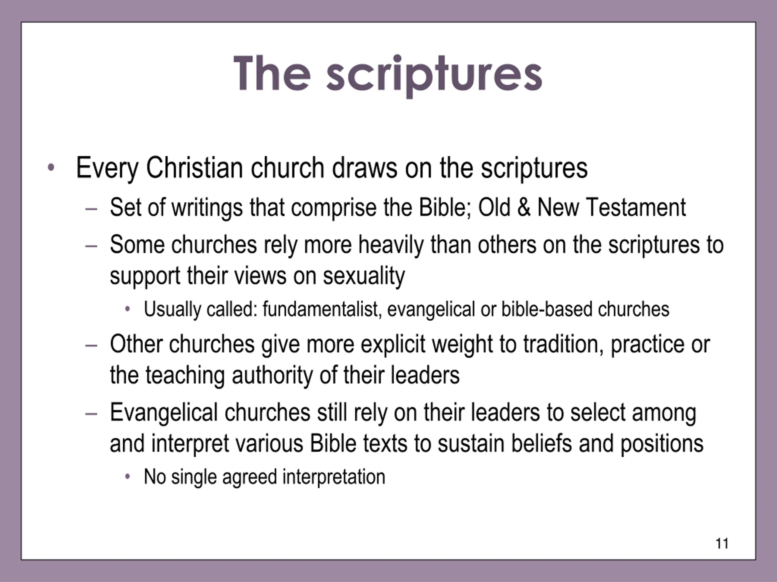 The scriptures Every Christian church draws on the scriptures Set of writings that comprise the Bible; Old & New Testament Some churches rely more heavily than others on the scriptures to support their views on sexuality Usually called: fundamentalist, evangelical or bible-based churches Other churches give more explicit weight to tradition, practice or the teaching authority of their leaders Evangelical churches still rely on their leaders to select among and interpret various Bible texts to sustain beliefs and positions No single agreed interpretation 11