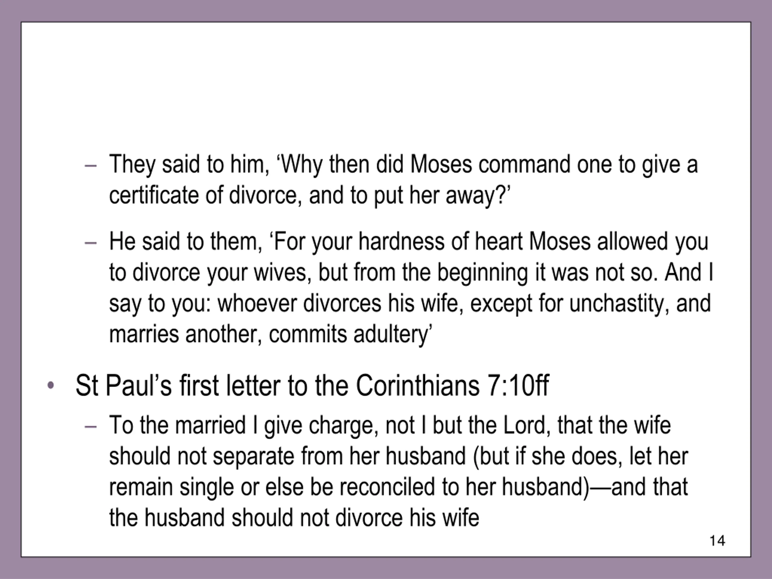 They said to him, Why then did Moses command one to give a certificate of divorce, and to put her away? He said to them, For your hardness of heart Moses allowed you to divorce your wives, but from the beginning it was not so. And I say to you: whoever divorces his wife, except for unchastity, and marries another, commits adultery St Paul s first letter to the Corinthians 7:10ff To the married I give charge, not I but the Lord, that the wife should not separate from her husband (but if she does, let her remain single or else be reconciled to her husband) and that the husband should not divorce his wife 14