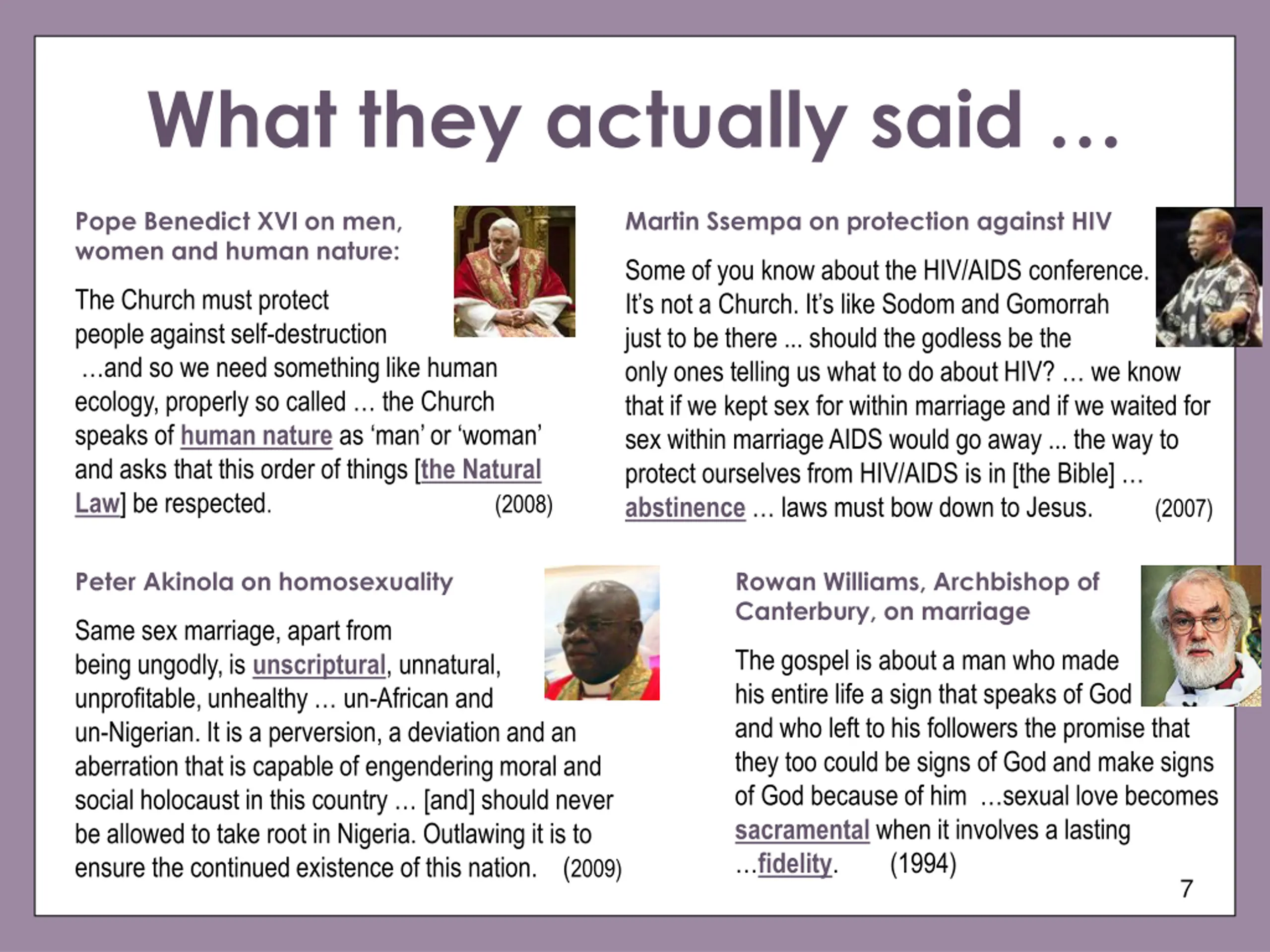 What they actually said Pope Benedict XVI on men, women and human nature: Martin Ssempa on protection against HIV _mg_9761 Some of you know about the HIV/AIDS conference. It s not a Church. It s like Sodom and Gomorrah just to be there ... should the godless be the only ones telling us what to do about HIV? we know that if we kept sex for within marriage and if we waited for sex within marriage AIDS would go away ... the way to protect ourselves from HIV/AIDS is in [the Bible] abstinence laws must bow down to Jesus.(2007) The Church must protect people against self-destruction and so we need something like human ecology, properly so called the Church speaks of human natureas man or woman and asks that this order of things [the Natural Law] be respected. (2008) Peter Akinola on homosexuality Rowan Williams, Archbishop of Canterbury, on marriage Same sex marriage, apart from being ungodly, is unscriptural, unnatural, unprofitable, unhealthy un-African and un-Nigerian. It is a perversion, a deviation and an aberration that is capable of engendering moral and social holocaust in this country [and] should never be allowed to take root in Nigeria. Outlawing it is to ensure the continued existence of this nation. (2009) The gospel is about a man who made his entire life a sign that speaks of God and who left to his followers the promise that they too could be signs of God and make signs of God because of him sexual love becomes sacramental when it involves a lasting fidelity. (1994) 7