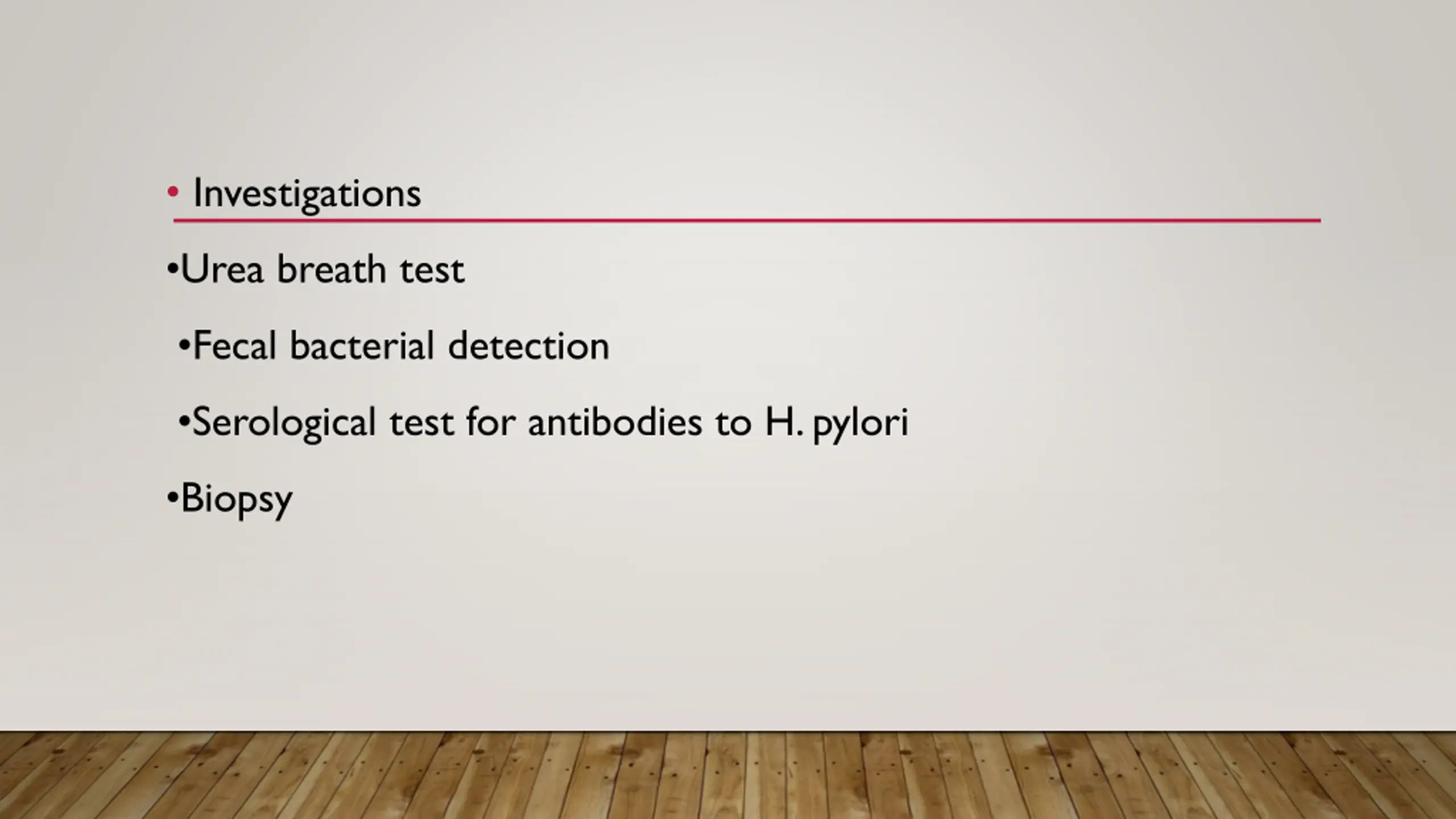 Investigations Urea breath test Fecal bacterial detection Serological test for antibodies to H. pylori Biopsy