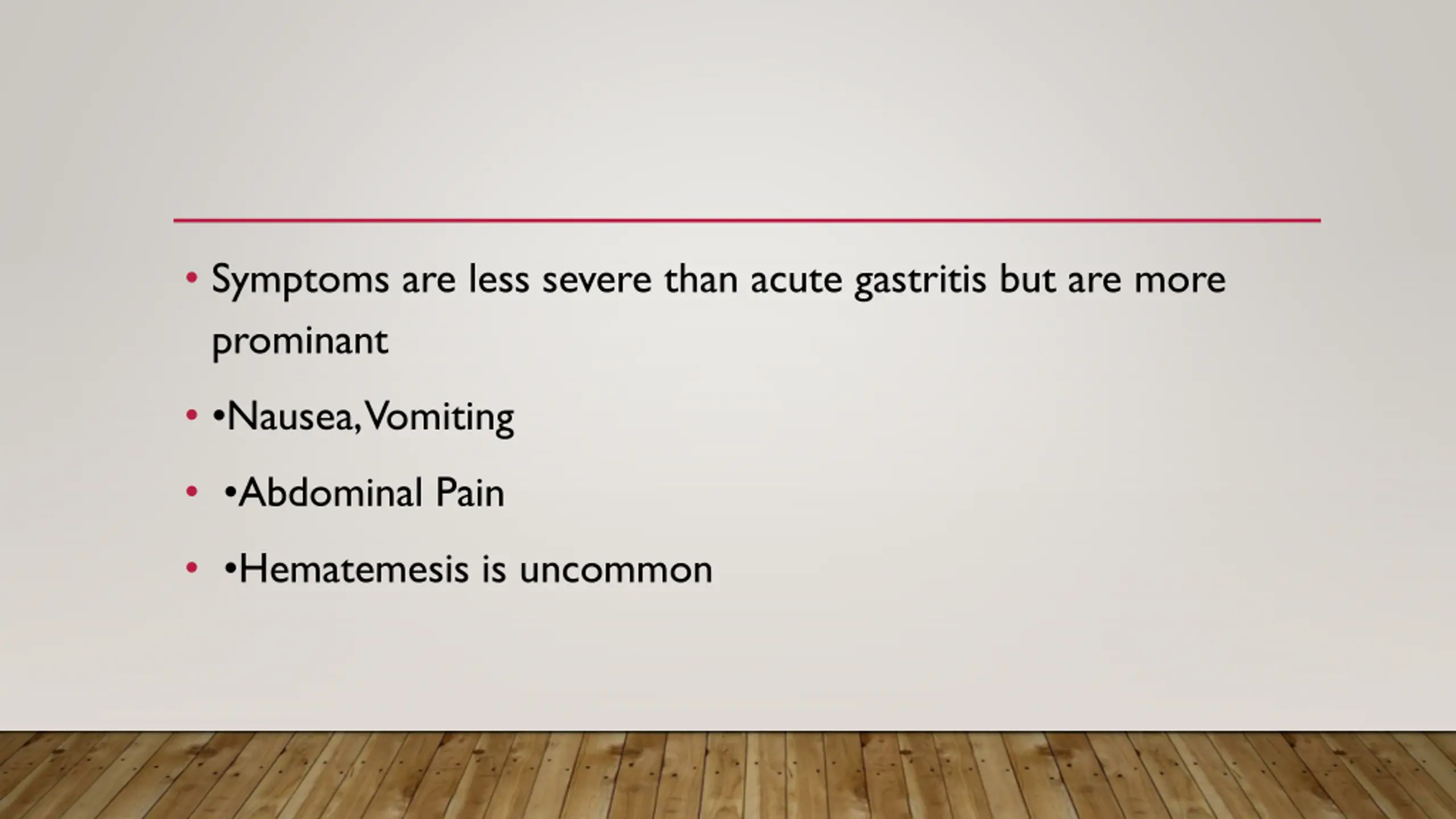 Symptoms are less severe than acute gastritis but are more prominant Nausea, Vomiting Abdominal Pain Hematemesis is uncommon