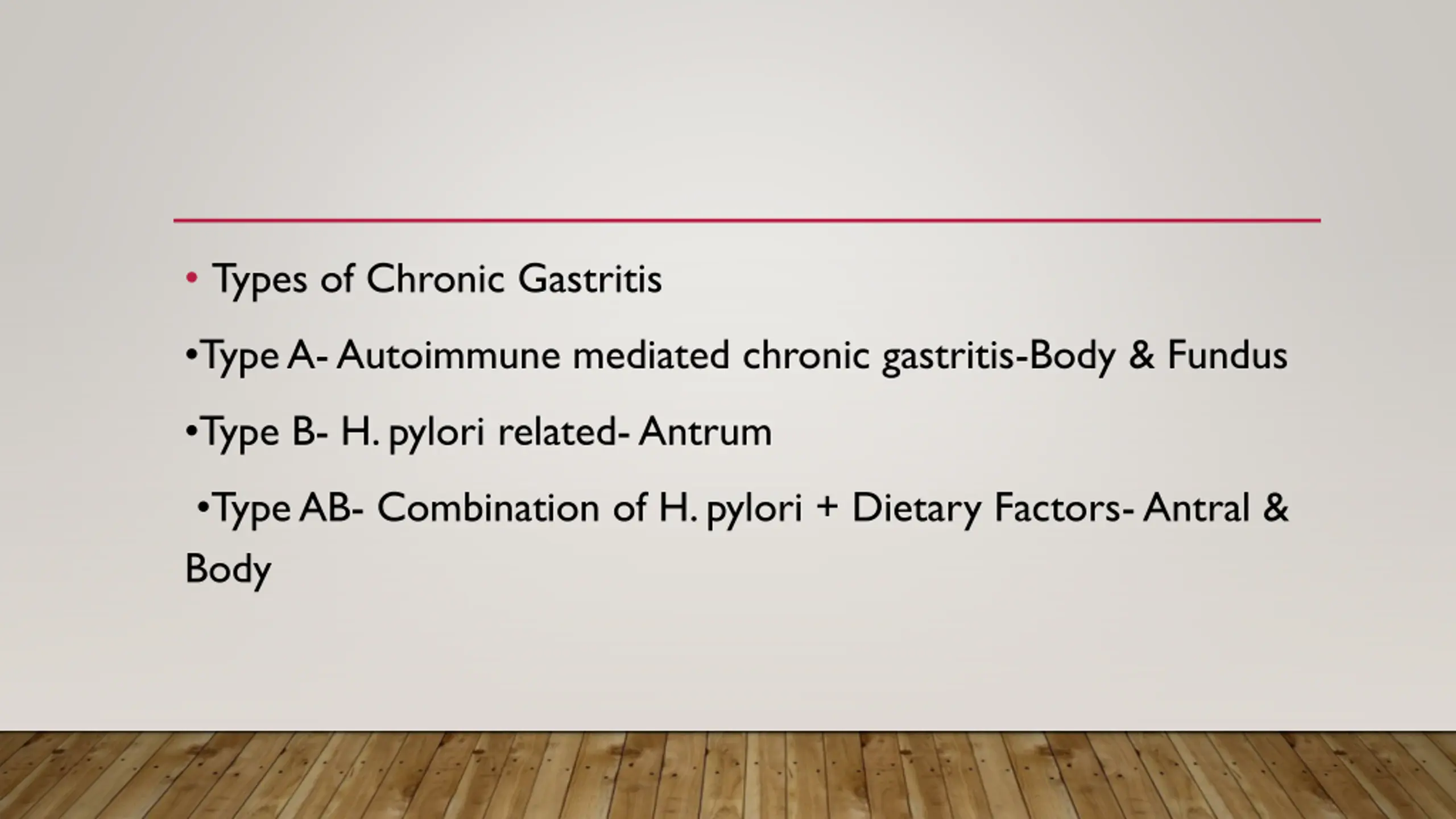 Types of Chronic Gastritis Type A- Autoimmune mediated chronic gastritis-Body & Fundus Type B- H. pylori related- Antrum Type AB- Combination of H. pylori + Dietary Factors- Antral & Body